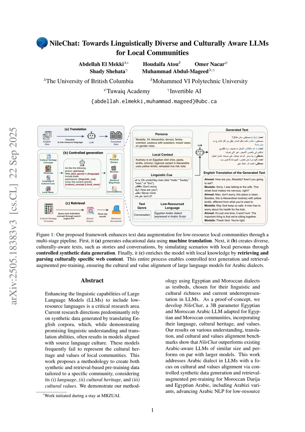 Enhancing the linguistic capabilities of Large Language Models (LLMs) to include low-resource languages is a critical research area. Current research directions predominantly rely on synthetic data generated by translating English corpora, which, while demonstrating promising linguistic understanding and translation abilities, often results in models aligned with source language culture. These models frequently fail to represent the cultural heritage and values of local communities. This work proposes a methodology to create both synthetic and retrieval-based pre-training data tailored to a specific community, considering its (i) language, (ii) cultural heritage, and (iii) cultural values. We demonstrate our methodology using Egyptian and Moroccan dialects as testbeds, chosen for their linguistic and cultural richness and current underrepresentation in LLMs. As a proof-of-concept, we develop NileChat, a 3B parameter Egyptian and Moroccan Arabic LLM adapted for Egyptian and Moroccan communities, incorporating their language, cultural heritage, and values. Our results on various understanding, translation, and cultural and values alignment benchmarks show that NileChat outperforms existing Arabic-aware LLMs of similar size and performs on par with larger models. This work addresses Arabic dialect in LLMs with a focus on cultural and values alignment via controlled synthetic data generation and retrieval-augmented pre-training for Moroccan Darija and Egyptian Arabic, including Arabizi variants, advancing Arabic NLP for low-resource communities. We share our methods, data, and models with the community to promote the inclusion and coverage of more diverse communities in cultural LLM development:this https URL.