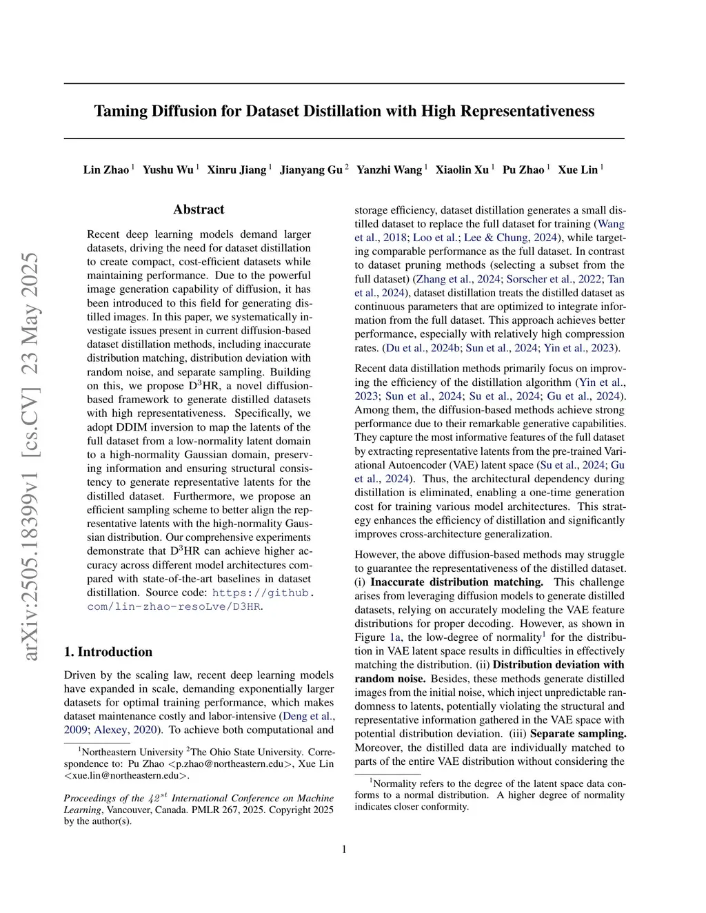 Recent deep learning models demand larger datasets, driving the need for dataset distillation to create compact, cost-efficient datasets while maintaining performance. Due to the powerful image generation capability of diffusion, it has been introduced to this field for generating distilled images. In this paper, we systematically investigate issues present in current diffusion-based dataset distillation methods, including inaccurate distribution matching, distribution deviation with random noise, and separate sampling. Building on this, we propose D^3HR, a novel diffusion-based framework to generate distilled datasets with high representativeness. Specifically, we adopt DDIM inversion to map the latents of the full dataset from a low-normality latent domain to a high-normality Gaussian domain, preserving information and ensuring structural consistency to generate representative latents for the distilled dataset. Furthermore, we propose an efficient sampling scheme to better align the representative latents with the high-normality Gaussian distribution. Our comprehensive experiments demonstrate that D^3HR can achieve higher accuracy across different model architectures compared with state-of-the-art baselines in dataset distillation. Source code:this https URL.