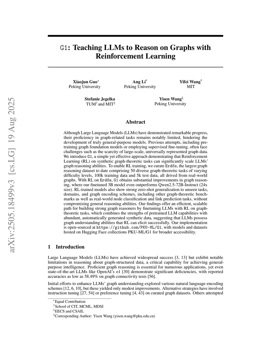Although Large Language Models (LLMs) have demonstrated remarkable progress, their proficiency in graph-related tasks remains notably limited, hindering the development of truly general-purpose models. Previous attempts, including pretraining graph foundation models or employing supervised fine-tuning, often face challenges such as the scarcity of large-scale, universally represented graph data. We introduce G1, a simple yet effective approach demonstrating that Reinforcement Learning (RL) on synthetic graph-theoretic tasks can significantly scale LLMs' graph reasoning abilities. To enable RL training, we curate Erdõs, the largest graph reasoning dataset to date comprising 50 diverse graph-theoretic tasks of varying difficulty levels, 100k training data and 5k test data, all drived from real-world graphs. With RL on Erdõs, G1 obtains substantial improvements in graph reasoning, where our finetuned 3B model even outperforms Qwen2.5-72B-Instruct (24x size). RL-trained models also show strong zero-shot generalization to unseen tasks, domains, and graph encoding schemes, including other graph-theoretic benchmarks as well as real-world node classification and link prediction tasks, without compromising general reasoning abilities. Our findings offer an efficient, scalable path for building strong graph reasoners by finetuning LLMs with RL on graph-theoretic tasks, which combines the strengths of pretrained LLM capabilities with abundant, automatically generated synthetic data, suggesting that LLMs possess graph understanding abilities that RL can elicit successfully. Our implementation is open-sourced at this https URL, with models and datasets hosted on Hugging Face collections this https URL for broader accessibility.