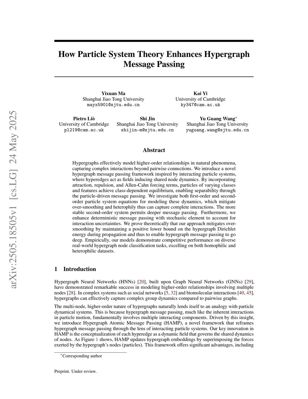 Hypergraphs effectively model higher-order relationships in natural phenomena, capturing complex interactions beyond pairwise connections. We introduce a novel hypergraph message passing framework inspired by interacting particle systems, where hyperedges act as fields inducing shared node dynamics. By incorporating attraction, repulsion, and Allen-Cahn forcing terms, particles of varying classes and features achieve class-dependent equilibrium, enabling separability through the particle-driven message passing. We investigate both first-order and second-order particle system equations for modeling these dynamics, which mitigate over-smoothing and heterophily thus can capture complete interactions. The more stable second-order system permits deeper message passing. Furthermore, we enhance deterministic message passing with stochastic element to account for interaction uncertainties. We prove theoretically that our approach mitigates over-smoothing by maintaining a positive lower bound on the hypergraph Dirichlet energy during propagation and thus to enable hypergraph message passing to go deep. Empirically, our models demonstrate competitive performance on diverse real-world hypergraph node classification tasks, excelling on both homophilic and heterophilic datasets.