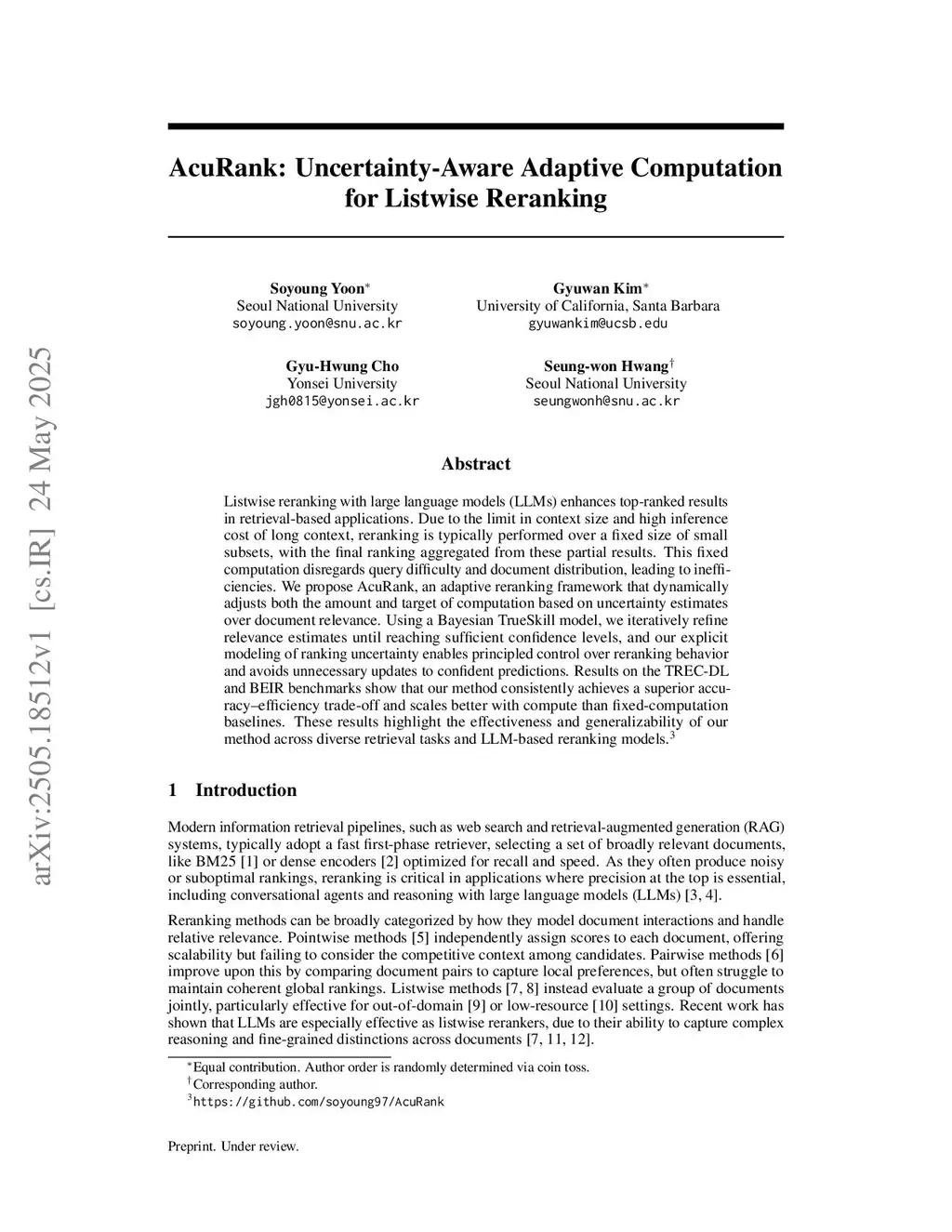Listwise reranking with large language models (LLMs) enhances top-ranked results in retrieval-based applications. Due to the limit in context size and high inference cost of long context, reranking is typically performed over a fixed size of small subsets, with the final ranking aggregated from these partial results. This fixed computation disregards query difficulty and document distribution, leading to inefficiencies. We propose AcuRank, an adaptive reranking framework that dynamically adjusts both the amount and target of computation based on uncertainty estimates over document relevance. Using a Bayesian TrueSkill model, we iteratively refine relevance estimates until reaching sufficient confidence levels, and our explicit modeling of ranking uncertainty enables principled control over reranking behavior and avoids unnecessary updates to confident predictions. Results on the TREC-DL and BEIR benchmarks show that our method consistently achieves a superior accuracy-efficiency trade-off and scales better with compute than fixed-computation baselines. These results highlight the effectiveness and generalizability of our method across diverse retrieval tasks and LLM-based reranking models.
