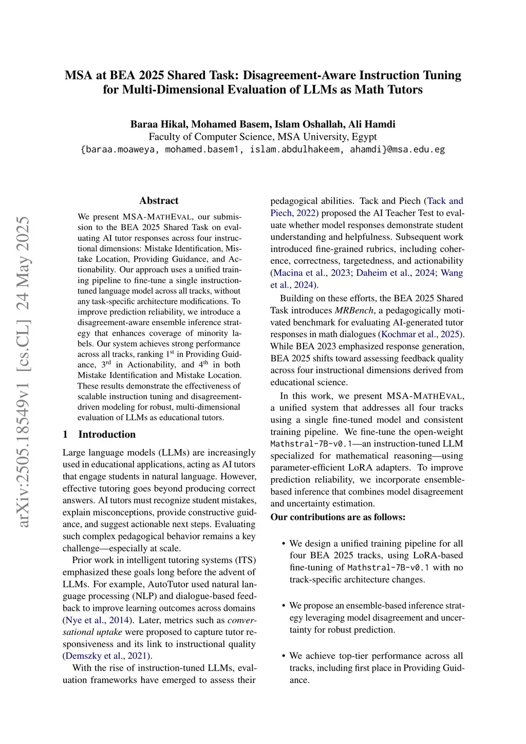 We present MSA-MathEval, our submission to the BEA 2025 Shared Task on evaluating AI tutor responses across four instructional dimensions: Mistake Identification, Mistake Location, Providing Guidance, and Actionability. Our approach uses a unified training pipeline to fine-tune a single instruction-tuned language model across all tracks, without any task-specific architectural changes. To improve prediction reliability, we introduce a disagreement-aware ensemble inference strategy that enhances coverage of minority labels. Our system achieves strong performance across all tracks, ranking 1st in Providing Guidance, 3rd in Actionability, and 4th in both Mistake Identification and Mistake Location. These results demonstrate the effectiveness of scalable instruction tuning and disagreement-driven modeling for robust, multi-dimensional evaluation of LLMs as educational tutors.