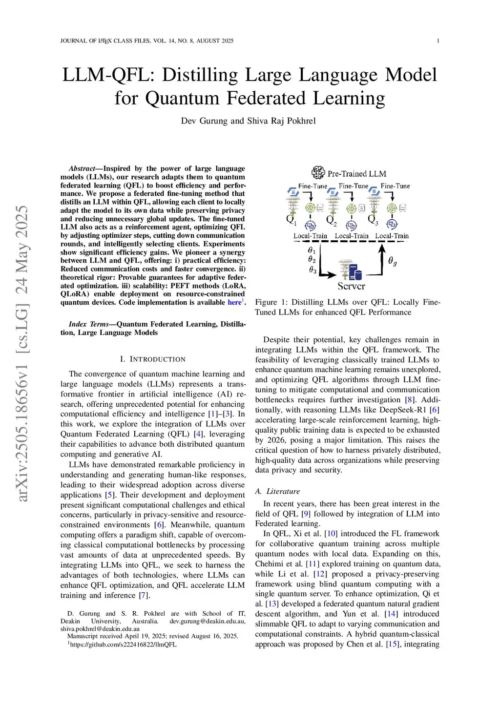 Inspired by the power of large language models (LLMs), our research adapts them to quantum federated learning (QFL) to boost efficiency and performance. We propose a federated fine-tuning method that distills an LLM within QFL, allowing each client to locally adapt the model to its own data while preserving privacy and reducing unnecessary global updates. The fine-tuned LLM also acts as a reinforcement agent, optimizing QFL by adjusting optimizer steps, cutting down communication rounds, and intelligently selecting clients. Experiments show significant efficiency gains. We pioneer a synergy between LLM and QFL, offering: i) practical efficiency: Reduced communication costs and faster convergence. ii) theoretical rigor: Provable guarantees for adaptive federated optimization. iii) scalability: PEFT methods (LoRA, QLoRA) enable deployment on resource-constrained quantum devices. Code implementation is available here 1.