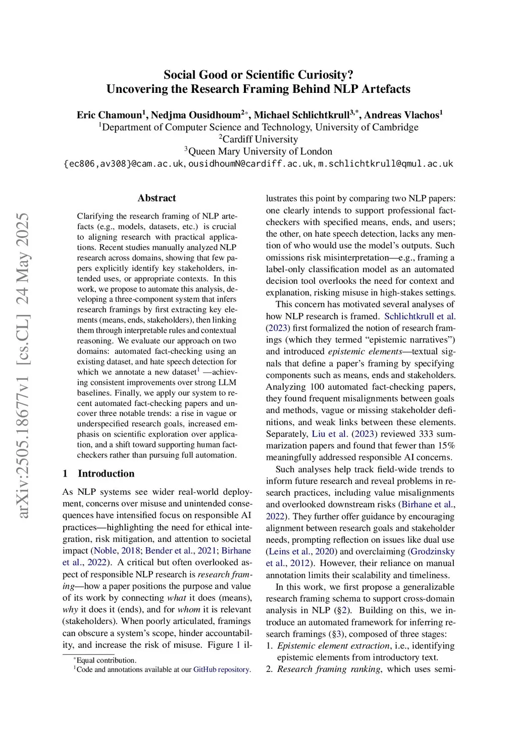 Clarifying the research framing of NLP artefacts (e.g., models, datasets, etc.) is crucial to aligning research with practical applications. Recent studies manually analyzed NLP research across domains, showing that few papers explicitly identify key stakeholders, intended uses, or appropriate contexts. In this work, we propose to automate this analysis, developing a three-component system that infers research framings by first extracting key elements (means, ends, stakeholders), then linking them through interpretable rules and contextual reasoning. We evaluate our approach on two domains: automated fact-checking using an existing dataset, and hate speech detection for which we annotate a new dataset-achieving consistent improvements over strong LLM baselines. Finally, we apply our system to recent automated fact-checking papers and uncover three notable trends: a rise in vague or underspecified research goals, increased emphasis on scientific exploration over application, and a shift toward supporting human fact-checkers rather than pursuing full automation.