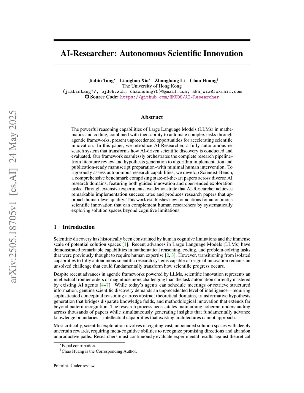 The powerful reasoning capabilities of Large Language Models (LLMs) in mathematics and coding, combined with their ability to automate complex tasks through agentic frameworks, present unprecedented opportunities for accelerating scientific innovation. In this paper, we introduce AI-Researcher, a fully autonomous research system that transforms how AI-driven scientific discovery is conducted and evaluated. Our framework seamlessly orchestrates the complete research pipeline--from literature review and hypothesis generation to algorithm implementation and publication-ready manuscript preparation--with minimal human intervention. To rigorously assess autonomous research capabilities, we develop Scientist-Bench, a comprehensive benchmark comprising state-of-the-art papers across diverse AI research domains, featuring both guided innovation and open-ended exploration tasks. Through extensive experiments, we demonstrate that AI-Researcher achieves remarkable implementation success rates and produces research papers that approach human-level quality. This work establishes new foundations for autonomous scientific innovation that can complement human researchers by systematically exploring solution spaces beyond cognitive limitations.