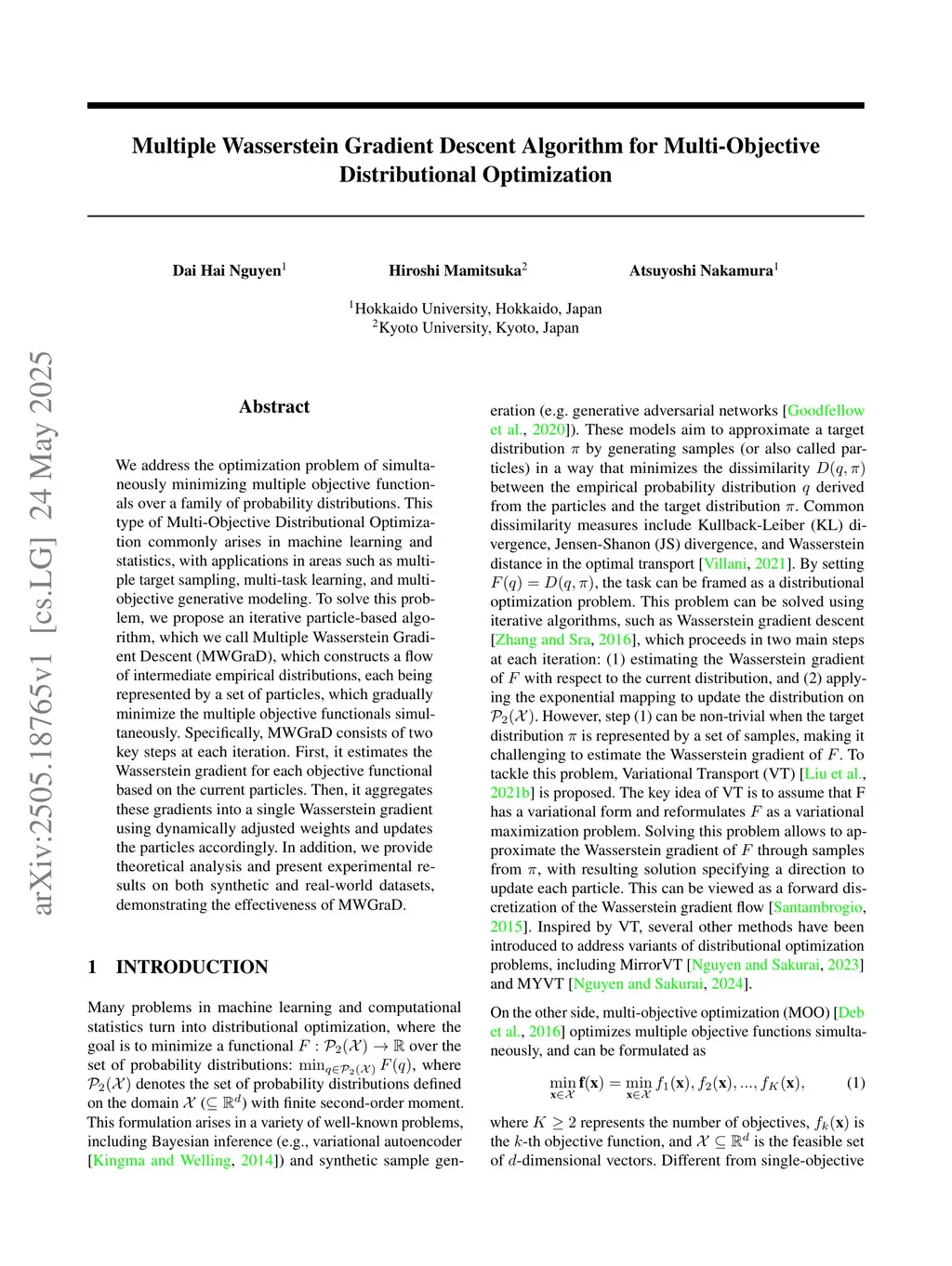 We address the optimization problem of simultaneously minimizing multiple objective functionals over a family of probability distributions. This type of Multi-Objective Distributional Optimization commonly arises in machine learning and statistics, with applications in areas such as multiple target sampling, multi-task learning, and multi-objective generative modeling. To solve this problem, we propose an iterative particle-based algorithm, which we call Muliple Wasserstein Gradient Descent (MWGraD), which constructs a flow of intermediate empirical distributions, each being represented by a set of particles, which gradually minimize the multiple objective functionals simultaneously. Specifically, MWGraD consists of two key steps at each iteration. First, it estimates the Wasserstein gradient for each objective functional based on the current particles. Then, it aggregates these gradients into a single Wasserstein gradient using dynamically adjusted weights and updates the particles accordingly. In addition, we provide theoretical analysis and present experimental results on both synthetic and real-world datasets, demonstrating the effectiveness of MWGraD.