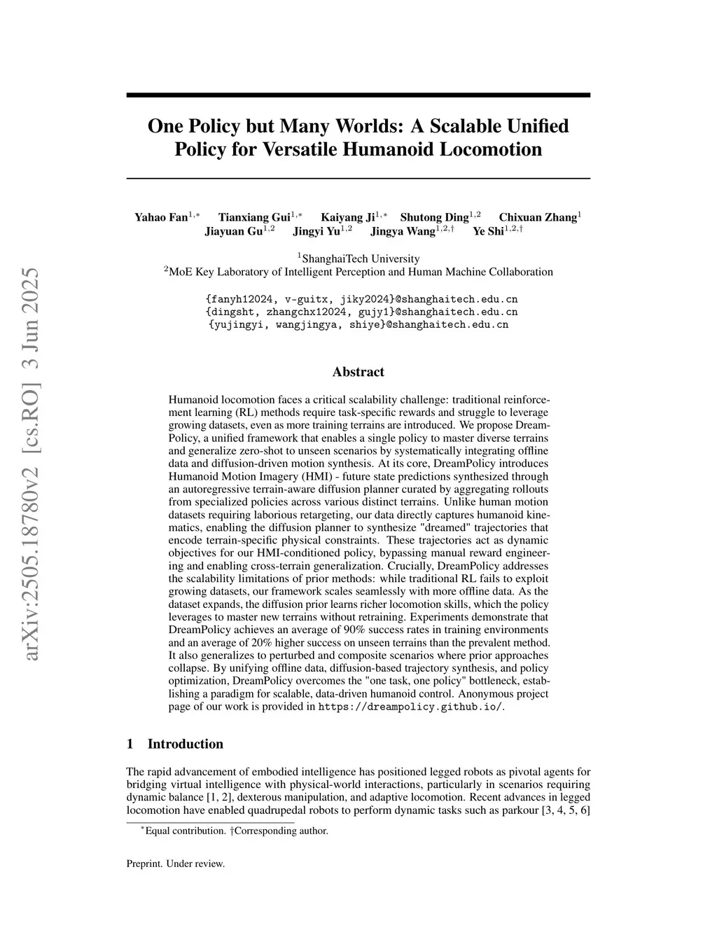 Humanoid locomotion faces a critical scalability challenge: traditional reinforcement learning (RL) methods require task-specific rewards and struggle to leverage growing datasets, even as more training terrains are introduced. We propose DreamPolicy, a unified framework that enables a single policy to master diverse terrains and generalize zero-shot to unseen scenarios by systematically integrating offline data and diffusion-driven motion synthesis. At its core, DreamPolicy introduces Humanoid Motion Imagery (HMI) - future state predictions synthesized through an autoregressive terrain-aware diffusion planner curated by aggregating rollouts from specialized policies across various distinct terrains. Unlike human motion datasets requiring laborious retargeting, our data directly captures humanoid kinematics, enabling the diffusion planner to synthesize "dreamed" trajectories that encode terrain-specific physical constraints. These trajectories act as dynamic objectives for our HMI-conditioned policy, bypassing manual reward engineering and enabling cross-terrain generalization. DreamPolicy addresses the scalability limitations of prior methods: while traditional RL fails to exploit growing datasets, our framework scales seamlessly with more offline data. As the dataset expands, the diffusion prior learns richer locomotion skills, which the policy leverages to master new terrains without retraining. Experiments demonstrate that DreamPolicy achieves average 90% success rates in training environments and an average of 20% higher success on unseen terrains than the prevalent method. It also generalizes to perturbed and composite scenarios where prior approaches collapse. By unifying offline data, diffusion-based trajectory synthesis, and policy optimization, DreamPolicy overcomes the "one task, one policy" bottleneck, establishing a paradigm for scalable, data-driven humanoid control.