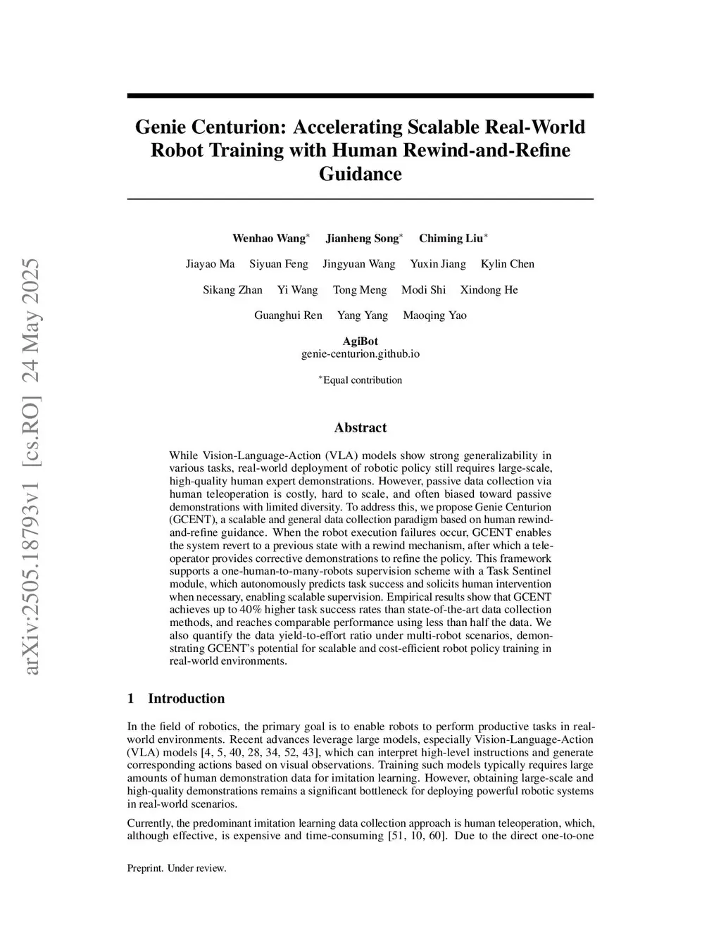 While Vision-Language-Action (VLA) models show strong generalizability in various tasks, real-world deployment of robotic policy still requires large-scale, high-quality human expert demonstrations. However, data collection via human teleoperation requires continuous operator attention, which is costly, hard to scale. To address this, we propose Genie Centurion (GCENT), a scalable and general data collection paradigm based on human rewind-and-refine guidance, enabling robots' interactive learning in deployment. GCENT starts at an imperfect policy and improves over time. When the robot execution failures occur, GCENT allows robots to revert to a previous state with a rewind mechanism, after which a teleoperator provides corrective demonstrations to refine the policy. This framework supports a one-human-to-many-robots supervision scheme with a Task Sentinel module, which autonomously predicts task success and solicits human intervention when necessary. Empirical results show that GCENT achieves up to 40% higher task success rates than state-of-the-art data collection methods, and reaches comparable performance using less than half the data in long-horizon and precise tasks. We also quantify the data yield-to-effort ratio under multi-robot scenarios, demonstrating GCENT's potential for scalable and cost-efficient robot policy training in real-world environments.
