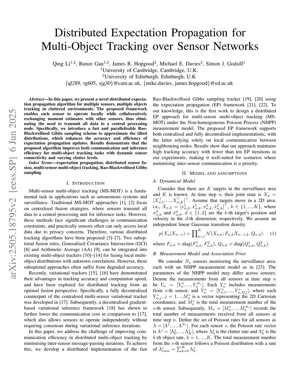 In this paper, we present a novel distributed expectation propagation algorithm for multiple sensors, multiple objects tracking in cluttered environments. The proposed framework enables each sensor to operate locally while collaboratively exchanging moment estimates with other sensors, thus eliminating the need to transmit all data to a central processing node. Specifically, we introduce a fast and parallelisable Rao-Blackwellised Gibbs sampling scheme to approximate the tilted distributions, which enhances the accuracy and efficiency of expectation propagation updates. Results demonstrate that the proposed algorithm improves both communication and inference efficiency for multi-object tracking tasks with dynamic sensor connectivity and varying clutter levels.