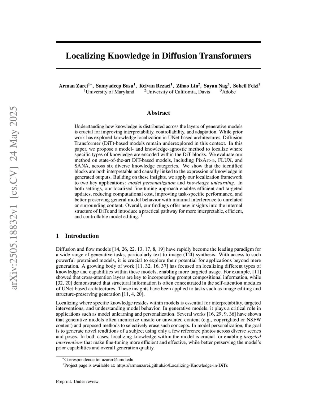 Understanding how knowledge is distributed across the layers of generative models is crucial for improving interpretability, controllability, and adaptation. While prior work has explored knowledge localization in UNet-based architectures, Diffusion Transformer (DiT)-based models remain underexplored in this context. In this paper, we propose a model- and knowledge-agnostic method to localize where specific types of knowledge are encoded within the DiT blocks. We evaluate our method on state-of-the-art DiT-based models, including PixArt-alpha, FLUX, and SANA, across six diverse knowledge categories. We show that the identified blocks are both interpretable and causally linked to the expression of knowledge in generated outputs. Building on these insights, we apply our localization framework to two key applications: model personalization and knowledge unlearning. In both settings, our localized fine-tuning approach enables efficient and targeted updates, reducing computational cost, improving task-specific performance, and better preserving general model behavior with minimal interference to unrelated or surrounding content. Overall, our findings offer new insights into the internal structure of DiTs and introduce a practical pathway for more interpretable, efficient, and controllable model editing.
