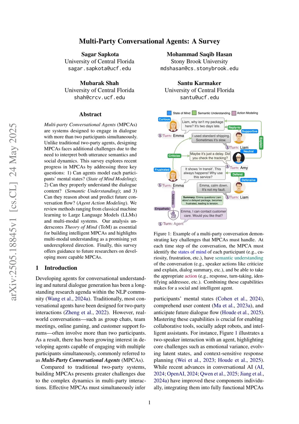 Multi-party Conversational Agents (MPCAs) are systems designed to engage in dialogue with more than two participants simultaneously. Unlike traditional two-party agents, designing MPCAs faces additional challenges due to the need to interpret both utterance semantics and social dynamics. This survey explores recent progress in MPCAs by addressing three key questions: 1) Can agents model each participants' mental states? (State of Mind Modeling); 2) Can they properly understand the dialogue content? (Semantic Understanding); and 3) Can they reason about and predict future conversation flow? (Agent Action Modeling). We review methods ranging from classical machine learning to Large Language Models (LLMs) and multi-modal systems. Our analysis underscores Theory of Mind (ToM) as essential for building intelligent MPCAs and highlights multi-modal understanding as a promising yet underexplored direction. Finally, this survey offers guidance to future researchers on developing more capable MPCAs.