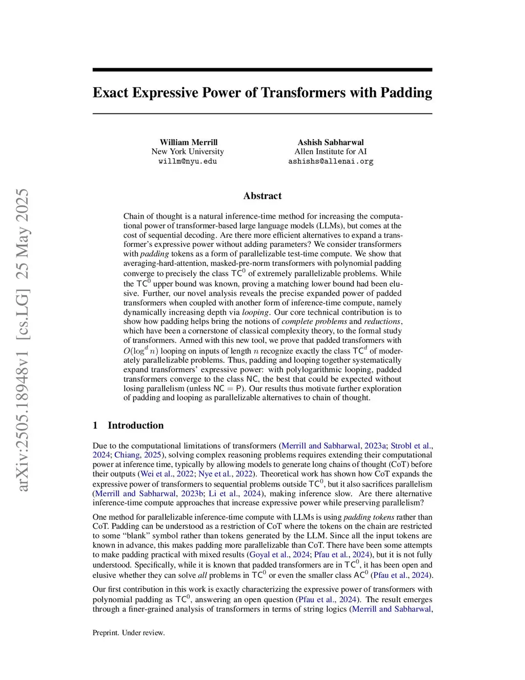 Chain of thought is a natural inference-time method for increasing the computational power of transformer-based large language models (LLMs), but comes at the cost of sequential decoding. Are there more efficient alternatives to expand a transformer's expressive power without adding parameters? We consider transformers with padding tokens as a form of parallelizable test-time compute. We show that averaging-hard-attention, masked-pre-norm transformers with polynomial padding recognize precisely the class -uniform of extremely parallelizable problems. While the upper bound was known, proving a matching lower bound had been elusive. Further, our novel analysis reveals the precise expanded power of padded transformers when coupled with another form of inference-time compute, namely dynamically increasing depth via looping. Our core technical contribution is to show how padding helps bring the notions of complete problems and reductions, which have been a cornerstone of classical complexity theory, to the formal study of transformers. Armed with this new tool, we prove that padded transformers with looping on inputs of length recognize exactly the class -uniform of moderately parallelizable problems. Thus, padding and looping together systematically expand transformers' expressive power: with polylogarithmic looping, polynomially padded transformers recognize precisely the class -uniform , the best that could be expected without losing parallelism (unless ). Our results thus motivate further exploration of padding and looping as parallelizable alternatives to chain of thought for test-time compute.