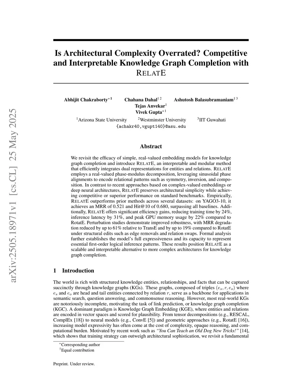 We revisit the efficacy of simple, real-valued embedding models for knowledge graph completion and introduce RelatE, an interpretable and modular method that efficiently integrates dual representations for entities and relations. RelatE employs a real-valued phase-modulus decomposition, leveraging sinusoidal phase alignments to encode relational patterns such as symmetry, inversion, and composition. In contrast to recent approaches based on complex-valued embeddings or deep neural architectures, RelatE preserves architectural simplicity while achieving competitive or superior performance on standard benchmarks. Empirically, RelatE outperforms prior methods across several datasets: on YAGO3-10, it achieves an MRR of 0.521 and Hit@10 of 0.680, surpassing all baselines. Additionally, RelatE offers significant efficiency gains, reducing training time by 24%, inference latency by 31%, and peak GPU memory usage by 22% compared to RotatE. Perturbation studies demonstrate improved robustness, with MRR degradation reduced by up to 61% relative to TransE and by up to 19% compared to RotatE under structural edits such as edge removals and relation swaps. Formal analysis further establishes the model's full expressiveness and its capacity to represent essential first-order logical inference patterns. These results position RelatE as a scalable and interpretable alternative to more complex architectures for knowledge graph completion.