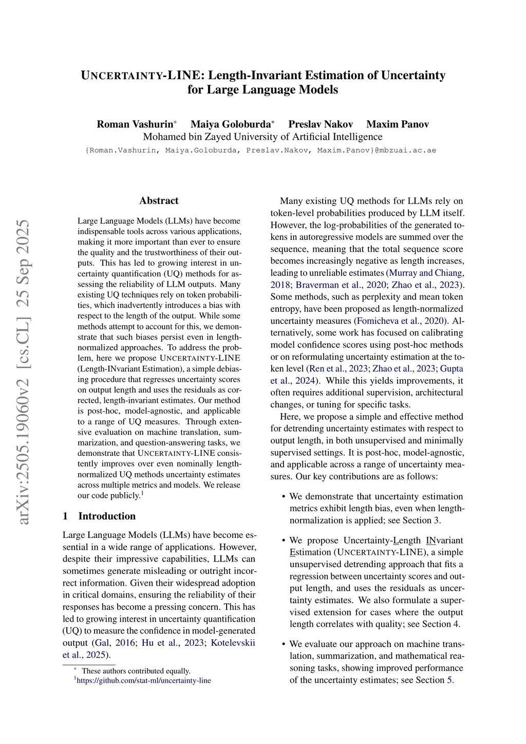 UNCERTAINTY-LINE: Length-Invariant Estimation of Uncertainty for Large Language Models