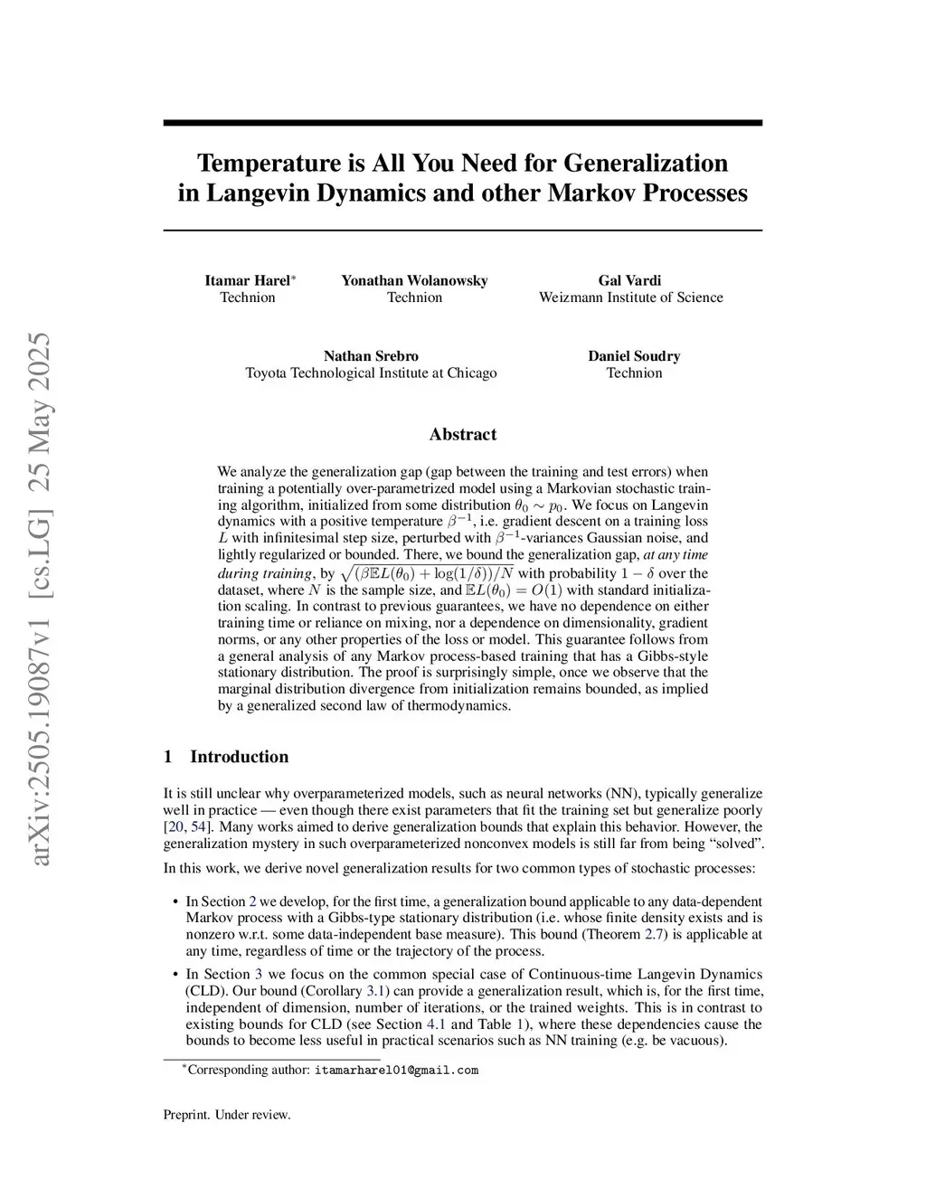 We analyze the generalization gap (gap between the training and test errors) when training a potentially over-parametrized model using a Markovian stochastic training algorithm, initialized from some distribution . We focus on Langevin dynamics with a positive temperature , i.e. gradient descent on a training loss with infinitesimal step size, perturbed with -variances Gaussian noise, and lightly regularized or bounded. There, we bound the generalization gap, at any time during training, by with probability over the dataset, where is the sample size, and with standard initialization scaling. In contrast to previous guarantees, we have no dependence on either training time or reliance on mixing, nor a dependence on dimensionality, gradient norms, or any other properties of the loss or model. This guarantee follows from a general analysis of any Markov process-based training that has a Gibbs-style stationary distribution. The proof is surprisingly simple, once we observe that the marginal distribution divergence from initialization remains bounded, as implied by a generalized second law of thermodynamics.