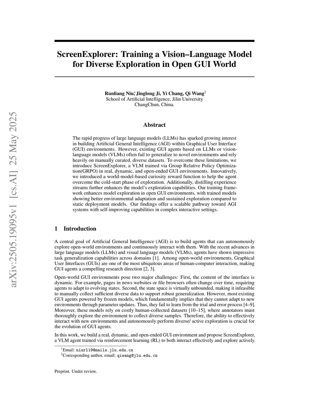 The rapid progress of large language models (LLMs) has sparked growing interest in building Artificial General Intelligence (AGI) within Graphical User Interface (GUI) environments. However, existing GUI agents based on LLMs or vision-language models (VLMs) often fail to generalize to novel environments and rely heavily on manually curated, diverse datasets. To overcome these limitations, we introduce ScreenExplorer, a VLM trained via Group Relative Policy Optimization(GRPO) in real, dynamic, and open-ended GUI environments. Innovatively, we introduced a world-model-based curiosity reward function to help the agent overcome the cold-start phase of exploration. Additionally, distilling experience streams further enhances the model's exploration capabilities. Our training framework enhances model exploration in open GUI environments, with trained models showing better environmental adaptation and sustained exploration compared to static deployment models. Our findings offer a scalable pathway toward AGI systems with self-improving capabilities in complex interactive settings.