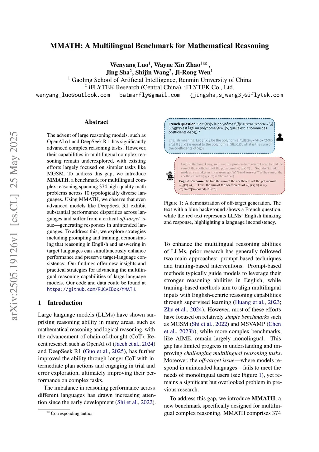 The advent of large reasoning models, such as OpenAI o1 and DeepSeek R1, has significantly advanced complex reasoning tasks. However, their capabilities in multilingual complex reasoning remain underexplored, with existing efforts largely focused on simpler tasks like MGSM. To address this gap, we introduce MMATH, a benchmark for multilingual complex reasoning spanning 374 high-quality math problems across 10 typologically diverse languages. Using MMATH, we observe that even advanced models like DeepSeek R1 exhibit substantial performance disparities across languages and suffer from a critical off-target issue-generating responses in unintended languages. To address this, we explore strategies including prompting and training, demonstrating that reasoning in English and answering in target languages can simultaneously enhance performance and preserve target-language consistency. Our findings offer new insights and practical strategies for advancing the multilingual reasoning capabilities of large language models. Our code and data could be found atthis https URL.