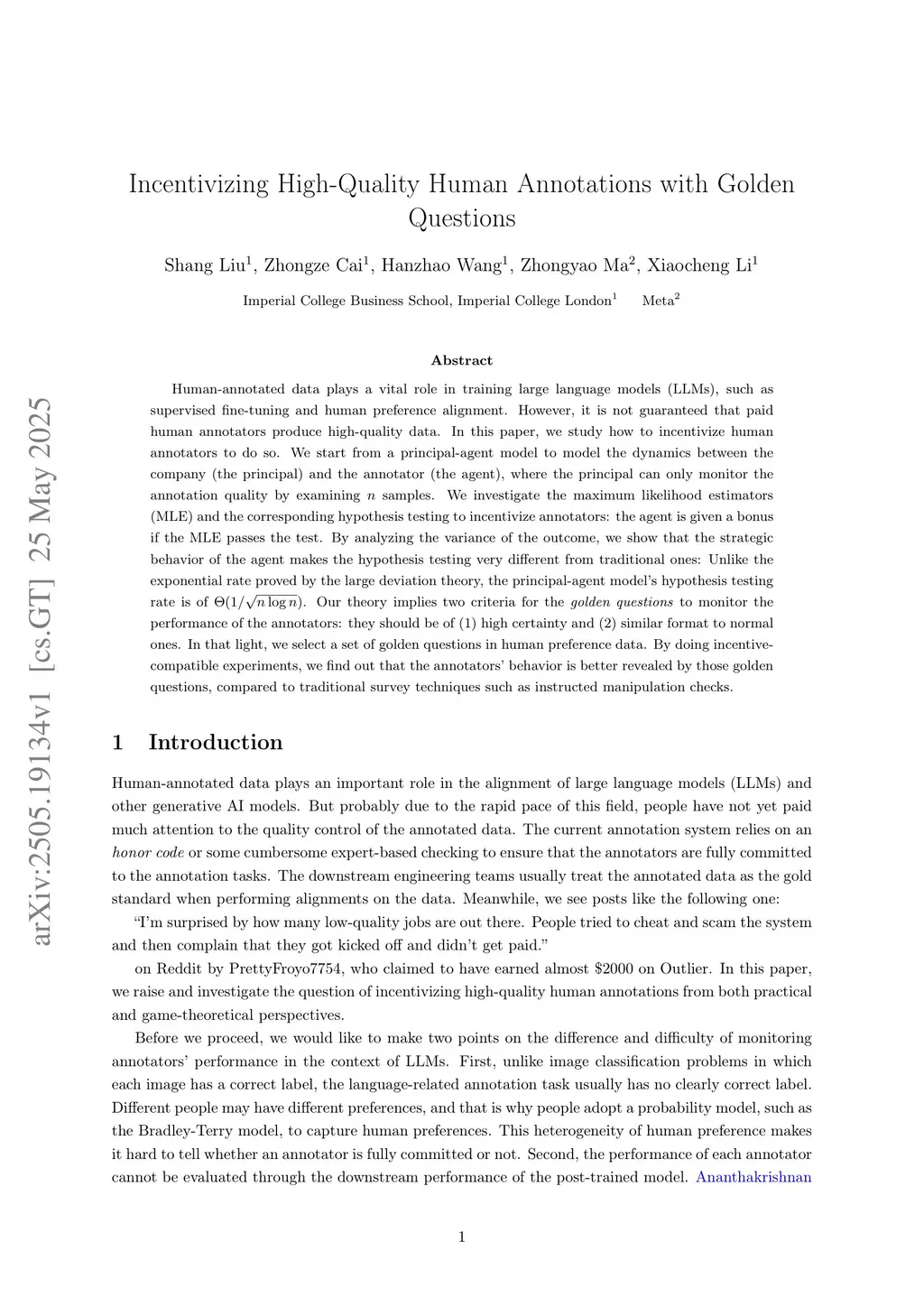 Human-annotated data plays a vital role in training large language models (LLMs), such as supervised fine-tuning and human preference alignment. However, it is not guaranteed that paid human annotators produce high-quality data. In this paper, we study how to incentivize human annotators to do so. We start from a principal-agent model to model the dynamics between the company (the principal) and the annotator (the agent), where the principal can only monitor the annotation quality by examining samples. We investigate the maximum likelihood estimators (MLE) and the corresponding hypothesis testing to incentivize annotators: the agent is given a bonus if the MLE passes the test. By analyzing the variance of the outcome, we show that the strategic behavior of the agent makes the hypothesis testing very different from traditional ones: Unlike the exponential rate proved by the large deviation theory, the principal-agent model's hypothesis testing rate is of . Our theory implies two criteria for the \emph{golden questions} to monitor the performance of the annotators: they should be of (1) high certainty and (2) similar format to normal ones. In that light, we select a set of golden questions in human preference data. By doing incentive-compatible experiments, we find out that the annotators' behavior is better revealed by those golden questions, compared to traditional survey techniques such as instructed manipulation checks.