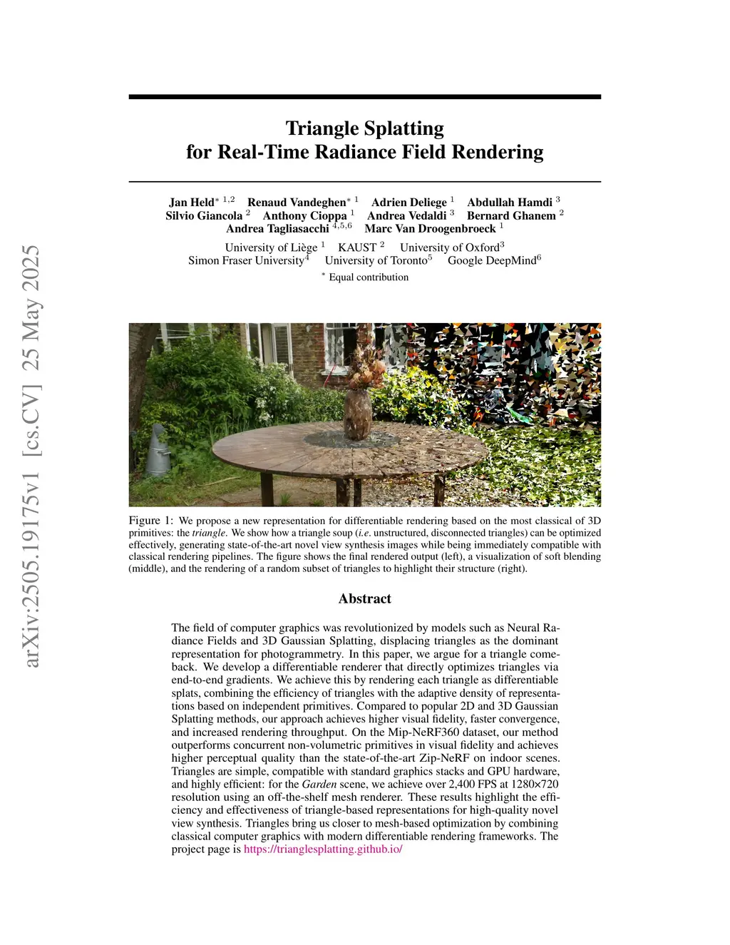 The field of computer graphics was revolutionized by models such as Neural Radiance Fields and 3D Gaussian Splatting, displacing triangles as the dominant representation for photogrammetry. In this paper, we argue for a triangle comeback. We develop a differentiable renderer that directly optimizes triangles via end-to-end gradients. We achieve this by rendering each triangle as differentiable splats, combining the efficiency of triangles with the adaptive density of representations based on independent primitives. Compared to popular 2D and 3D Gaussian Splatting methods, our approach achieves higher visual fidelity, faster convergence, and increased rendering throughput. On the Mip-NeRF360 dataset, our method outperforms concurrent non-volumetric primitives in visual fidelity and achieves higher perceptual quality than the state-of-the-art Zip-NeRF on indoor scenes. Triangles are simple, compatible with standard graphics stacks and GPU hardware, and highly efficient: for the \textit{Garden} scene, we achieve over 2,400 FPS at 1280x720 resolution using an off-the-shelf mesh renderer. These results highlight the efficiency and effectiveness of triangle-based representations for high-quality novel view synthesis. Triangles bring us closer to mesh-based optimization by combining classical computer graphics with modern differentiable rendering frameworks. The project page isthis https URL