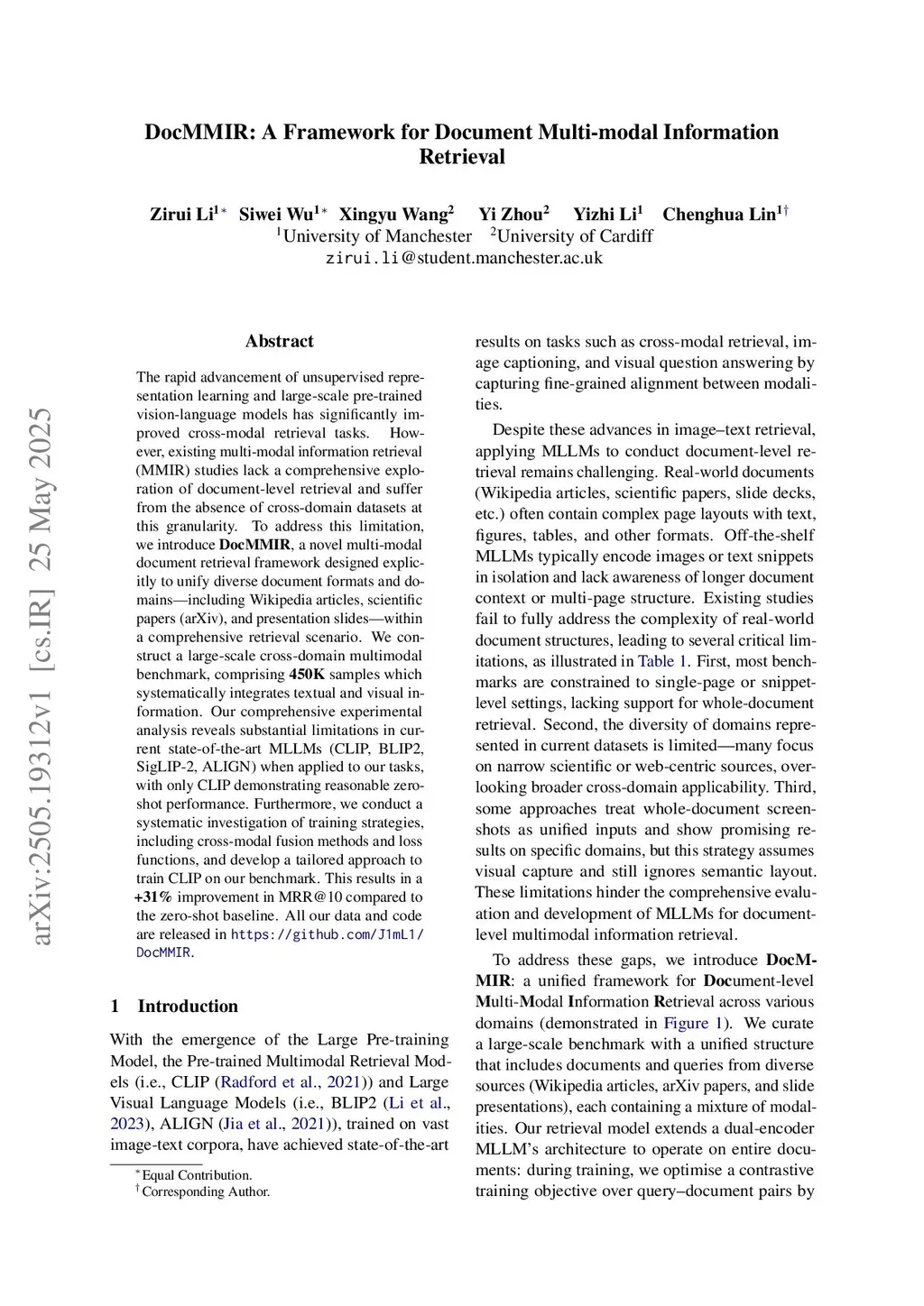 The rapid advancement of unsupervised representation learning and large-scale pre-trained vision-language models has significantly improved cross-modal retrieval tasks. However, existing multi-modal information retrieval (MMIR) studies lack a comprehensive exploration of document-level retrieval and suffer from the absence of cross-domain datasets at this granularity. To address this limitation, we introduce DocMMIR, a novel multi-modal document retrieval framework designed explicitly to unify diverse document formats and domains, including Wikipedia articles, scientific papers (arXiv), and presentation slides, within a comprehensive retrieval scenario. We construct a large-scale cross-domain multimodal benchmark, comprising 450K samples, which systematically integrates textual and visual information. Our comprehensive experimental analysis reveals substantial limitations in current state-of-the-art MLLMs (CLIP, BLIP2, SigLIP-2, ALIGN) when applied to our tasks, with only CLIP demonstrating reasonable zero-shot performance. Furthermore, we conduct a systematic investigation of training strategies, including cross-modal fusion methods and loss functions, and develop a tailored approach to train CLIP on our benchmark. This results in a +31% improvement in MRR@10 compared to the zero-shot baseline. All our data and code are released inthis https URL.
