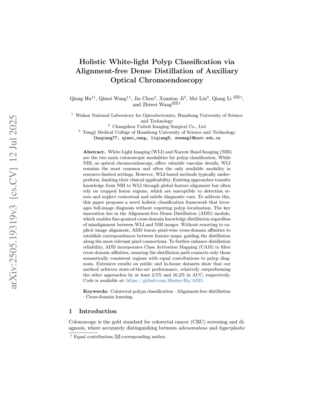 White Light Imaging (WLI) and Narrow Band Imaging (NBI) are the two main colonoscopic modalities for polyp classification. While NBI, as optical chromoendoscopy, offers valuable vascular details, WLI remains the most common and often the only available modality in resource-limited settings. However, WLI-based methods typically underperform, limiting their clinical applicability. Existing approaches transfer knowledge from NBI to WLI through global feature alignment but often rely on cropped lesion regions, which are susceptible to detection errors and neglect contextual and subtle diagnostic cues. To address this, this paper proposes a novel holistic classification framework that leverages full-image diagnosis without requiring polyp localization. The key innovation lies in the Alignment-free Dense Distillation (ADD) module, which enables fine-grained cross-domain knowledge distillation regardless of misalignment between WLI and NBI images. Without resorting to explicit image alignment, ADD learns pixel-wise cross-domain affinities to establish correspondences between feature maps, guiding the distillation along the most relevant pixel connections. To further enhance distillation reliability, ADD incorporates Class Activation Mapping (CAM) to filter cross-domain affinities, ensuring the distillation path connects only those semantically consistent regions with equal contributions to polyp diagnosis. Extensive results on public and in-house datasets show that our method achieves state-of-the-art performance, relatively outperforming the other approaches by at least 2.5% and 16.2% in AUC, respectively. Code is available at:this https URL.