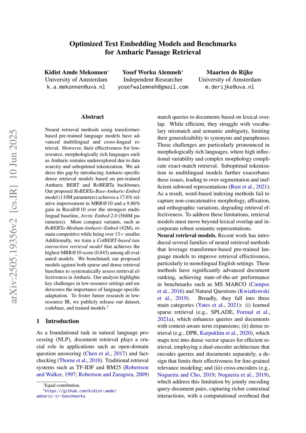 Neural retrieval methods using transformer-based pre-trained language models have advanced multilingual and cross-lingual retrieval. However, their effectiveness for low-resource, morphologically rich languages such as Amharic remains underexplored due to data scarcity and suboptimal tokenization. We address this gap by introducing Amharic-specific dense retrieval models based on pre-trained Amharic BERT and RoBERTa backbones. Our proposed RoBERTa-Base-Amharic-Embed model (110M parameters) achieves a 17.6% relative improvement in MRR@10 and a 9.86% gain in Recall@10 over the strongest multilingual baseline, Arctic Embed 2.0 (568M parameters). More compact variants, such as RoBERTa-Medium-Amharic-Embed (42M), remain competitive while being over 13x smaller. Additionally, we train a ColBERT-based late interaction retrieval model that achieves the highest MRR@10 score (0.843) among all evaluated models. We benchmark our proposed models against both sparse and dense retrieval baselines to systematically assess retrieval effectiveness in Amharic. Our analysis highlights key challenges in low-resource settings and underscores the importance of language-specific adaptation. To foster future research in low-resource IR, we publicly release our dataset, codebase, and trained models atthis https URL.