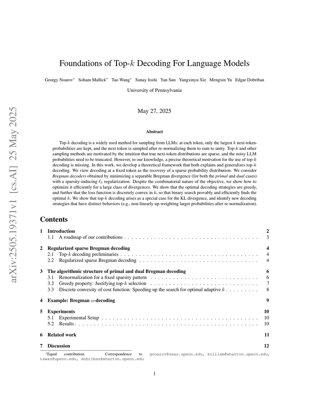 Top- decoding is a widely used method for sampling from LLMs: at each token, only the largest next-token-probabilities are kept, and the next token is sampled after re-normalizing them to sum to unity. Top- and other sampling methods are motivated by the intuition that true next-token distributions are sparse, and the noisy LLM probabilities need to be truncated. However, to our knowledge, a precise theoretical motivation for the use of top- decoding is missing. In this work, we develop a theoretical framework that both explains and generalizes top- decoding. We view decoding at a fixed token as the recovery of a sparse probability distribution. We consider \emph{Bregman decoders} obtained by minimizing a separable Bregman divergence (for both the \emph{primal} and \emph{dual} cases) with a sparsity-inducing regularization. Despite the combinatorial nature of the objective, we show how to optimize it efficiently for a large class of divergences. We show that the optimal decoding strategies are greedy, and further that the loss function is discretely convex in , so that binary search provably and efficiently finds the optimal . We show that top- decoding arises as a special case for the KL divergence, and identify new decoding strategies that have distinct behaviors (e.g., non-linearly up-weighting larger probabilities after re-normalization).