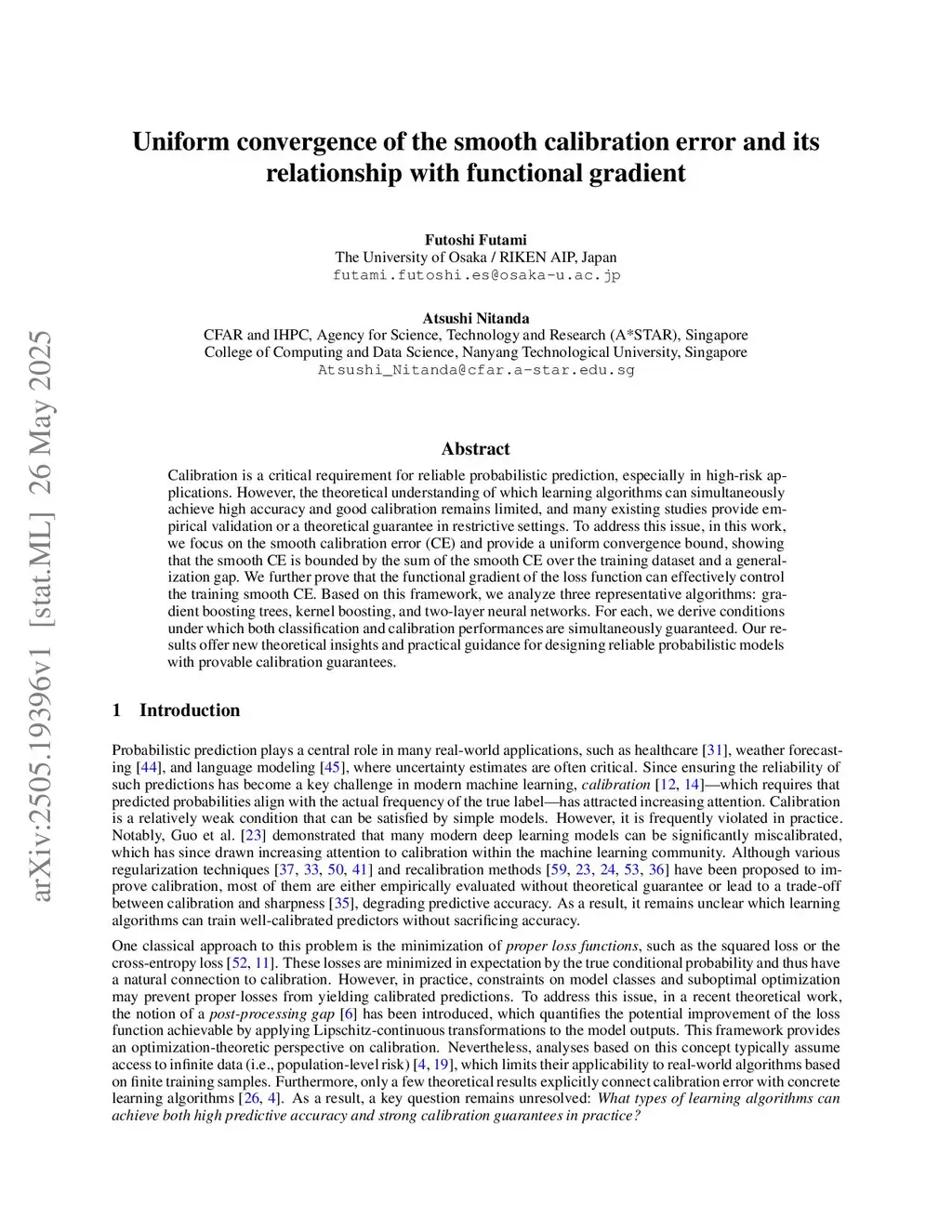 Calibration is a critical requirement for reliable probabilistic prediction, especially in high-risk applications. However, the theoretical understanding of which learning algorithms can simultaneously achieve high accuracy and good calibration remains limited, and many existing studies provide empirical validation or a theoretical guarantee in restrictive settings. To address this issue, in this work, we focus on the smooth calibration error (CE) and provide a uniform convergence bound, showing that the smooth CE is bounded by the sum of the smooth CE over the training dataset and a generalization gap. We further prove that the functional gradient of the loss function can effectively control the training smooth CE. Based on this framework, we analyze three representative algorithms: gradient boosting trees, kernel boosting, and two-layer neural networks. For each, we derive conditions under which both classification and calibration performances are simultaneously guaranteed. Our results offer new theoretical insights and practical guidance for designing reliable probabilistic models with provable calibration guarantees.