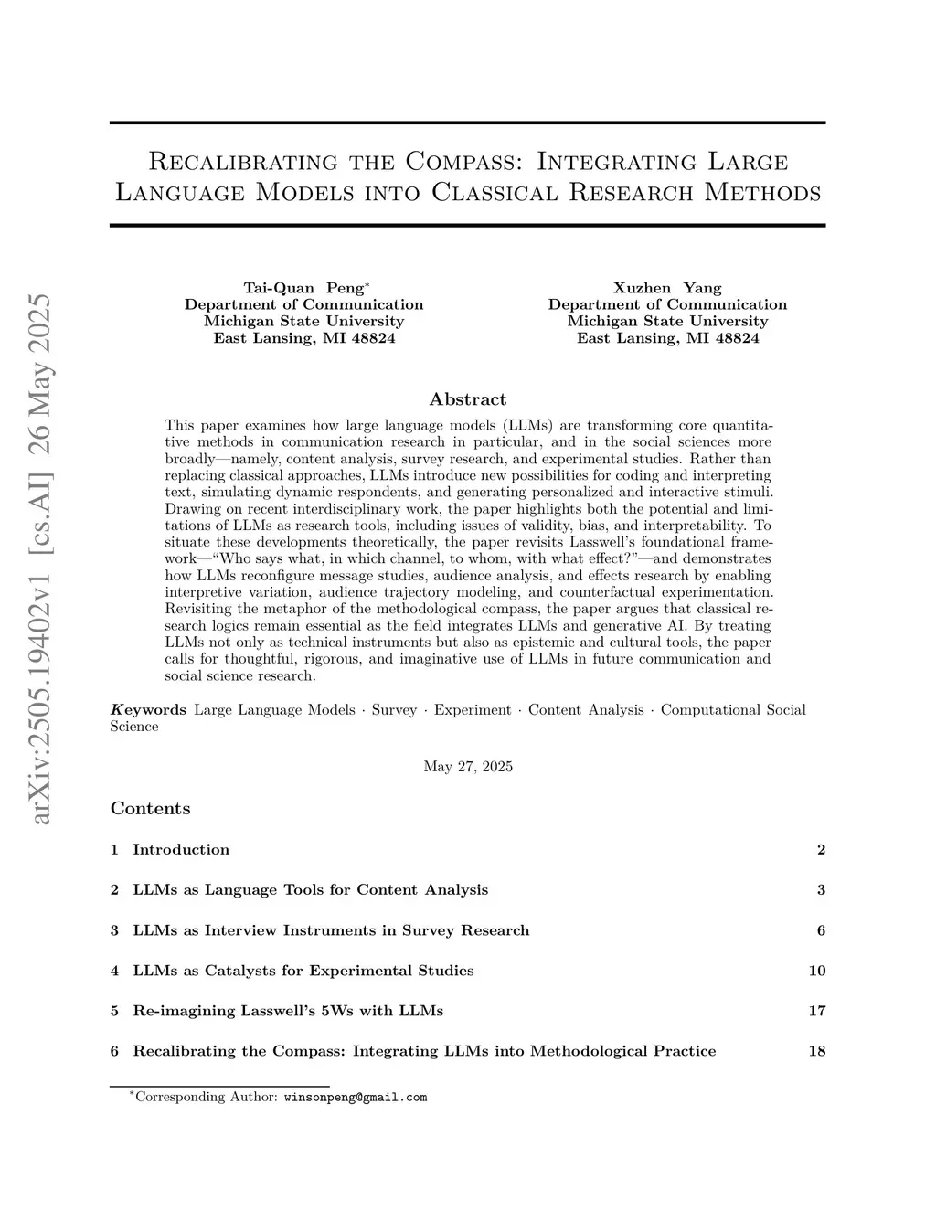 This paper examines how large language models (LLMs) are transforming core quantitative methods in communication research in particular, and in the social sciences more broadly-namely, content analysis, survey research, and experimental studies. Rather than replacing classical approaches, LLMs introduce new possibilities for coding and interpreting text, simulating dynamic respondents, and generating personalized and interactive stimuli. Drawing on recent interdisciplinary work, the paper highlights both the potential and limitations of LLMs as research tools, including issues of validity, bias, and interpretability. To situate these developments theoretically, the paper revisits Lasswell's foundational framework -- "Who says what, in which channel, to whom, with what effect?" -- and demonstrates how LLMs reconfigure message studies, audience analysis, and effects research by enabling interpretive variation, audience trajectory modeling, and counterfactual experimentation. Revisiting the metaphor of the methodological compass, the paper argues that classical research logics remain essential as the field integrates LLMs and generative AI. By treating LLMs not only as technical instruments but also as epistemic and cultural tools, the paper calls for thoughtful, rigorous, and imaginative use of LLMs in future communication and social science research.