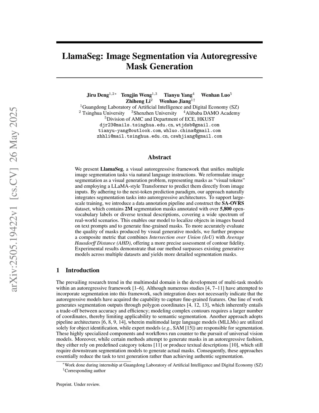 We present LlamaSeg, a visual autoregressive framework that unifies multiple image segmentation tasks via natural language instructions. We reformulate image segmentation as a visual generation problem, representing masks as "visual" tokens and employing a LLaMA-style Transformer to predict them directly from image inputs. By adhering to the next-token prediction paradigm, our approach naturally integrates segmentation tasks into autoregressive architectures. To support large-scale training, we introduce a data annotation pipeline and construct the SA-OVRS dataset, which contains 2M segmentation masks annotated with over 5,800 open-vocabulary labels or diverse textual descriptions, covering a wide spectrum of real-world scenarios. This enables our model to localize objects in images based on text prompts and to generate fine-grained masks. To more accurately evaluate the quality of masks produced by visual generative models, we further propose a composite metric that combines Intersection over Union (IoU) with Average Hausdorff Distance (AHD), offering a more precise assessment of contour fidelity. Experimental results demonstrate that our method surpasses existing generative models across multiple datasets and yields more detailed segmentation masks.