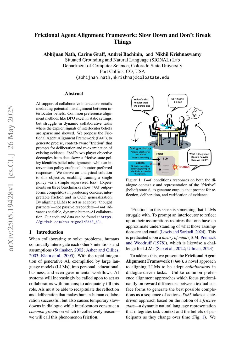 AI support of collaborative interactions entails mediating potential misalignment between interlocutor beliefs. Common preference alignment methods like DPO excel in static settings, but struggle in dynamic collaborative tasks where the explicit signals of interlocutor beliefs are sparse and skewed. We propose the Frictional Agent Alignment Framework (FAAF), to generate precise, context-aware "friction" that prompts for deliberation and re-examination of existing evidence. FAAF's two-player objective decouples from data skew: a frictive-state policy identifies belief misalignments, while an intervention policy crafts collaborator-preferred responses. We derive an analytical solution to this objective, enabling training a single policy via a simple supervised loss. Experiments on three benchmarks show FAAF outperforms competitors in producing concise, interpretable friction and in OOD generalization. By aligning LLMs to act as adaptive "thought partners" -- not passive responders -- FAAF advances scalable, dynamic human-AI collaboration. Our code and data can be found atthis https URL.