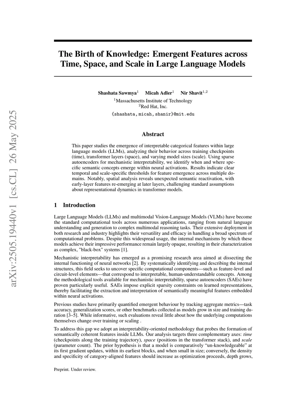 The Birth of Knowledge: Emergent Features across Time, Space, and Scale in Large Language Models