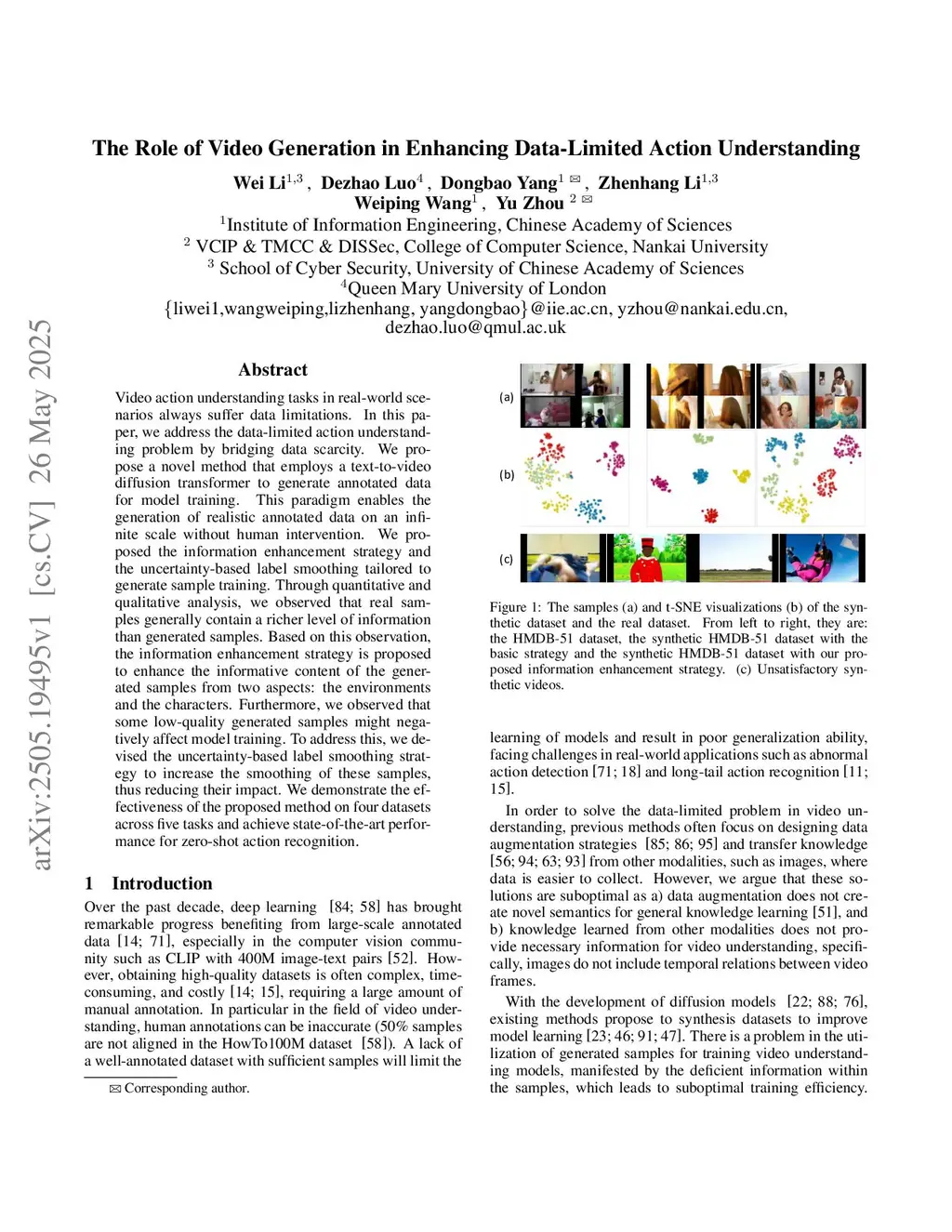 Video action understanding tasks in real-world scenarios always suffer data limitations. In this paper, we address the data-limited action understanding problem by bridging data scarcity. We propose a novel method that employs a text-to-video diffusion transformer to generate annotated data for model training. This paradigm enables the generation of realistic annotated data on an infinite scale without human intervention. We proposed the information enhancement strategy and the uncertainty-based label smoothing tailored to generate sample training. Through quantitative and qualitative analysis, we observed that real samples generally contain a richer level of information than generated samples. Based on this observation, the information enhancement strategy is proposed to enhance the informative content of the generated samples from two aspects: the environments and the characters. Furthermore, we observed that some low-quality generated samples might negatively affect model training. To address this, we devised the uncertainty-based label smoothing strategy to increase the smoothing of these samples, thus reducing their impact. We demonstrate the effectiveness of the proposed method on four datasets across five tasks and achieve state-of-the-art performance for zero-shot action recognition.