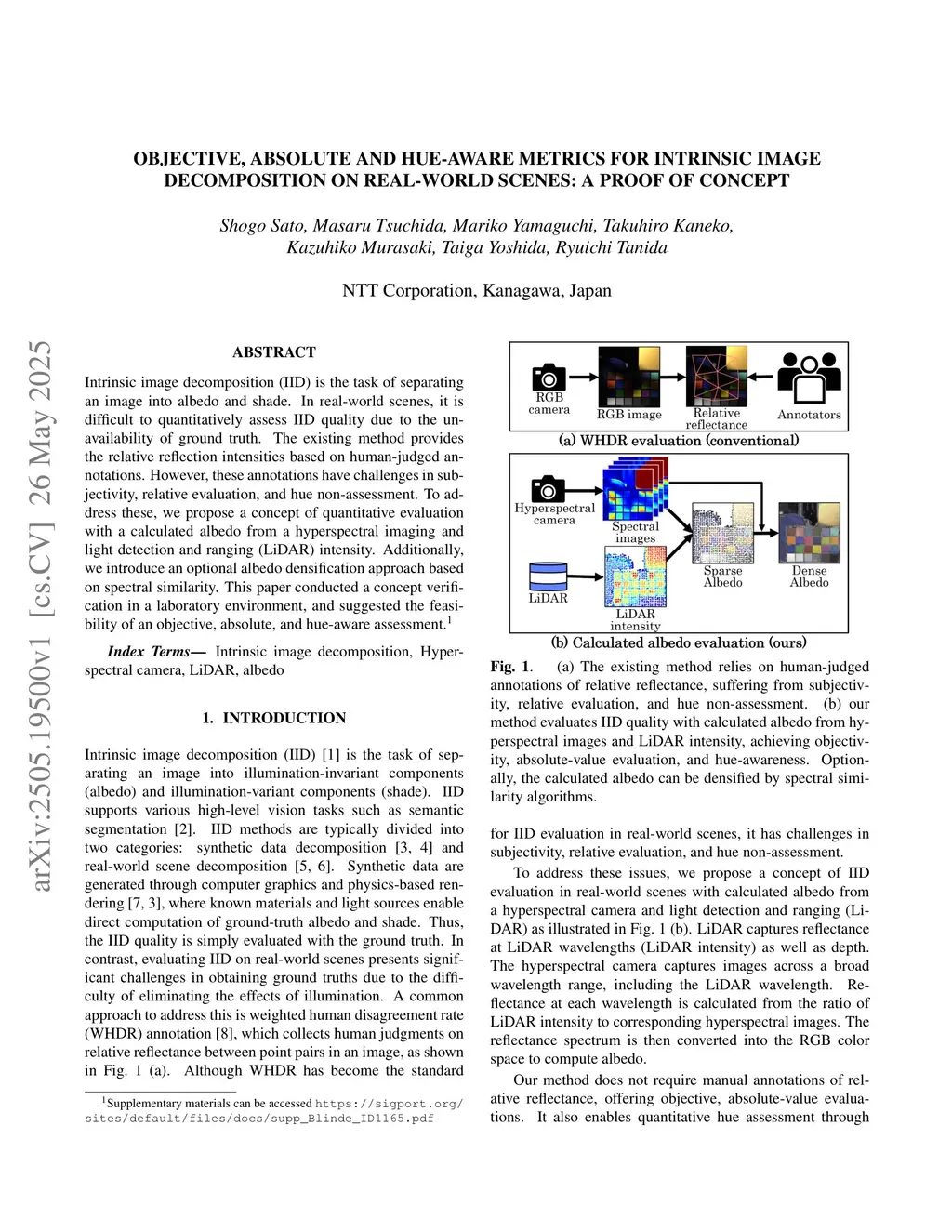 Intrinsic image decomposition (IID) is the task of separating an image into albedo and shade. In real-world scenes, it is difficult to quantitatively assess IID quality due to the unavailability of ground truth. The existing method provides the relative reflection intensities based on human-judged annotations. However, these annotations have challenges in subjectivity, relative evaluation, and hue non-assessment. To address these, we propose a concept of quantitative evaluation with a calculated albedo from a hyperspectral imaging and light detection and ranging (LiDAR) intensity. Additionally, we introduce an optional albedo densification approach based on spectral similarity. This paper conducted a concept verification in a laboratory environment, and suggested the feasibility of an objective, absolute, and hue-aware assessment. (This paper is accepted by IEEE ICIP 2025. )