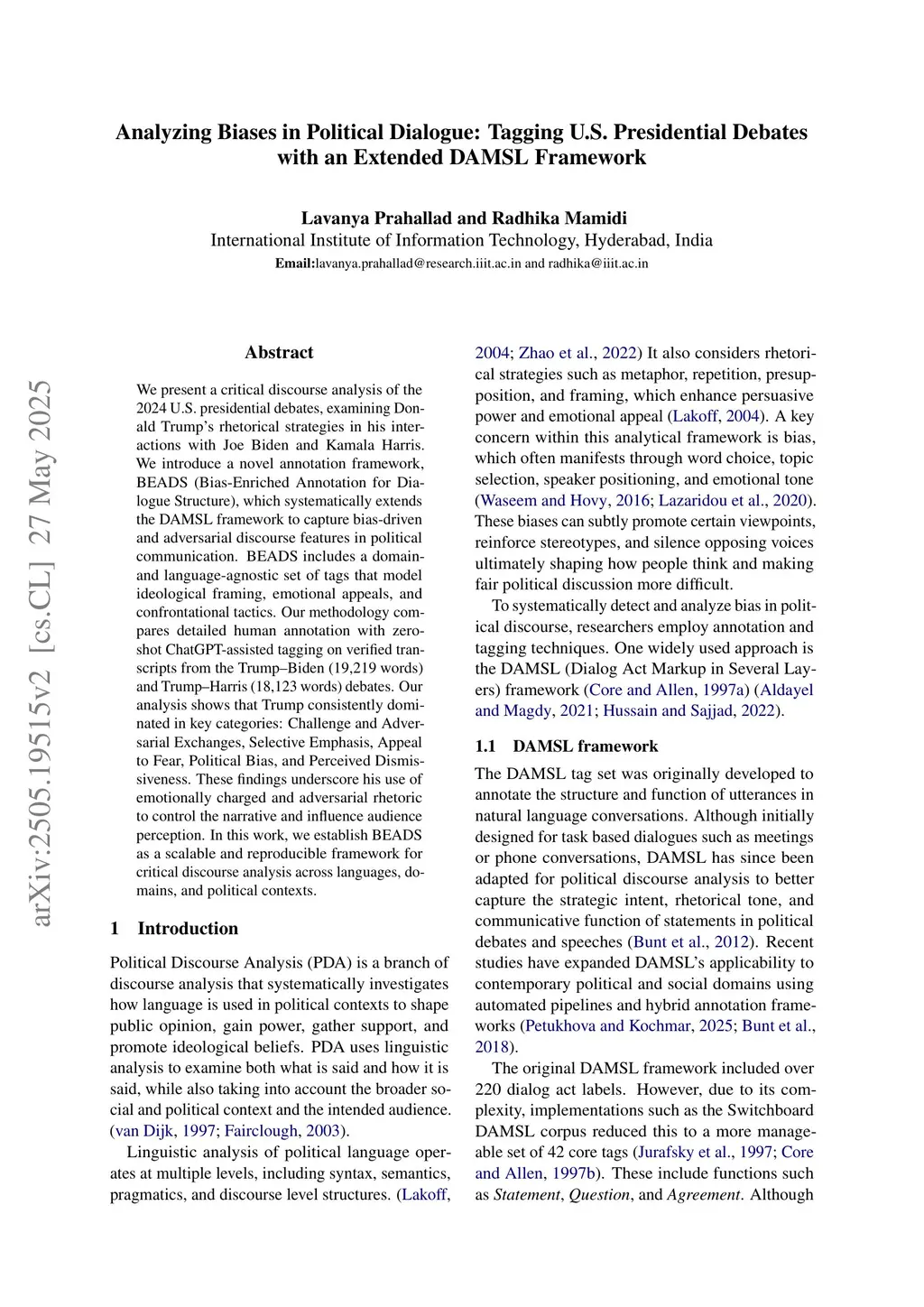 We present a critical discourse analysis of the 2024 U.S. presidential debates, examining Donald Trump's rhetorical strategies in his interactions with Joe Biden and Kamala Harris. We introduce a novel annotation framework, BEADS (Bias Enriched Annotation for Dialogue Structure), which systematically extends the DAMSL framework to capture bias driven and adversarial discourse features in political communication. BEADS includes a domain and language agnostic set of tags that model ideological framing, emotional appeals, and confrontational tactics. Our methodology compares detailed human annotation with zero shot ChatGPT assisted tagging on verified transcripts from the Trump and Biden (19,219 words) and Trump and Harris (18,123 words) debates. Our analysis shows that Trump consistently dominated in key categories: Challenge and Adversarial Exchanges, Selective Emphasis, Appeal to Fear, Political Bias, and Perceived Dismissiveness. These findings underscore his use of emotionally charged and adversarial rhetoric to control the narrative and influence audience perception. In this work, we establish BEADS as a scalable and reproducible framework for critical discourse analysis across languages, domains, and political contexts.