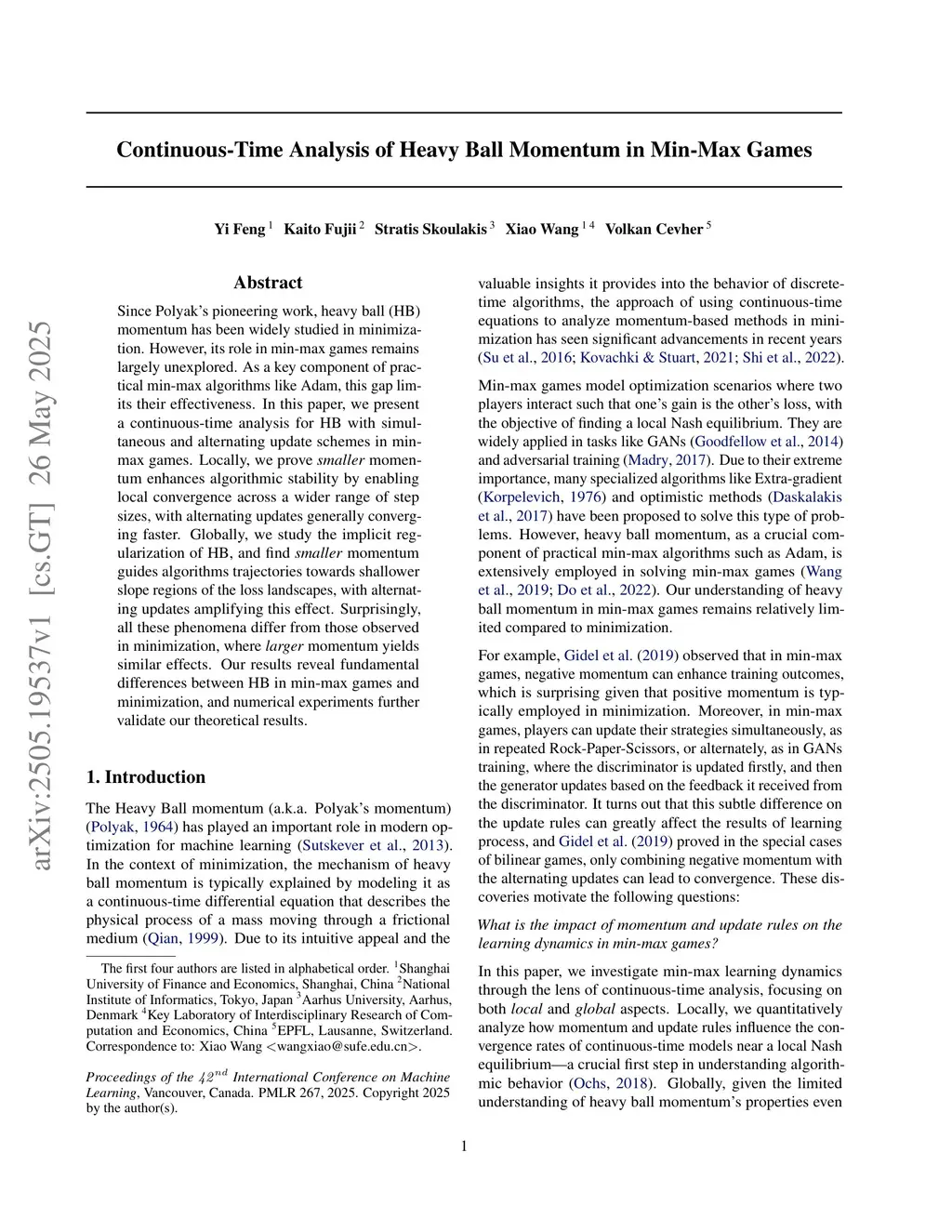Since Polyak's pioneering work, heavy ball (HB) momentum has been widely studied in minimization. However, its role in min-max games remains largely unexplored. As a key component of practical min-max algorithms like Adam, this gap limits their effectiveness. In this paper, we present a continuous-time analysis for HB with simultaneous and alternating update schemes in min-max games. Locally, we prove smaller momentum enhances algorithmic stability by enabling local convergence across a wider range of step sizes, with alternating updates generally converging faster. Globally, we study the implicit regularization of HB, and find smaller momentum guides algorithms trajectories towards shallower slope regions of the loss landscapes, with alternating updates amplifying this effect. Surprisingly, all these phenomena differ from those observed in minimization, where larger momentum yields similar effects. Our results reveal fundamental differences between HB in min-max games and minimization, and numerical experiments further validate our theoretical results.