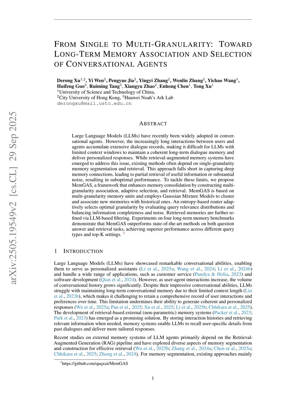 Large Language Models (LLMs) have recently been widely adopted in conversational agents. However, the increasingly long interactions between users and agents accumulate extensive dialogue records, making it difficult for LLMs with limited context windows to maintain a coherent long-term dialogue memory and deliver personalized responses. While retrieval-augmented memory systems have emerged to address this issue, existing methods often depend on single-granularity memory segmentation and retrieval. This approach falls short in capturing deep memory connections, leading to partial retrieval of useful information or substantial noise, resulting in suboptimal performance. To tackle these limits, we propose MemGAS, a framework that enhances memory consolidation by constructing multi-granularity association, adaptive selection, and retrieval. MemGAS is based on multi-granularity memory units and employs Gaussian Mixture Models to cluster and associate new memories with historical ones. An entropy-based router adaptively selects optimal granularity by evaluating query relevance distributions and balancing information completeness and noise. Retrieved memories are further refined via LLM-based filtering. Experiments on four long-term memory benchmarks demonstrate that MemGAS outperforms state-of-the-art methods on both question answer and retrieval tasks, achieving superior performance across different query types and top-K settings. \footnote{this https URL}