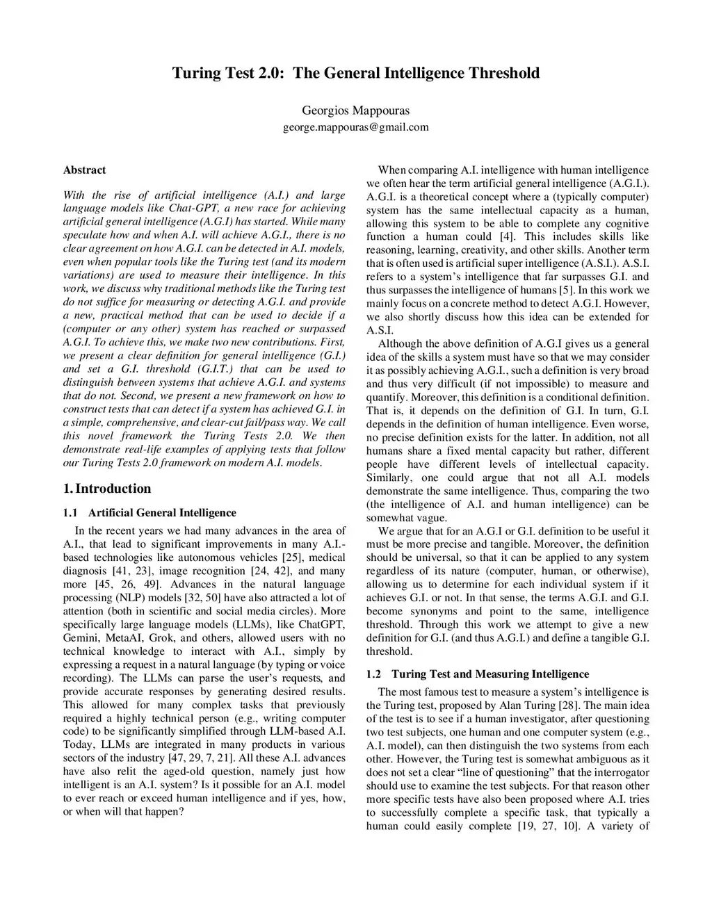 With the rise of artificial intelligence (A.I.) and large language models like ChatGPT, a new race for achieving artificial general intelligence (A.G.I) has started. While many speculate how and when A.I. will achieve A.G.I., there is no clear agreement on how A.G.I. can be detected in A.I. models, even when popular tools like the Turing test (and its modern variations) are used to measure their intelligence. In this work, we discuss why traditional methods like the Turing test do not suffice for measuring or detecting A.G.I. and provide a new, practical method that can be used to decide if a system (computer or any other) has reached or surpassed A.G.I. To achieve this, we make two new contributions. First, we present a clear definition for general intelligence (G.I.) and set a G.I. Threshold (G.I.T.) that can be used to distinguish between systems that achieve A.G.I. and systems that do not. Second, we present a new framework on how to construct tests that can detect if a system has achieved G.I. in a simple, comprehensive, and clear-cut fail/pass way. We call this novel framework the Turing test 2.0. We then demonstrate real-life examples of applying tests that follow our Turing test 2.0 framework on modern A.I. models.