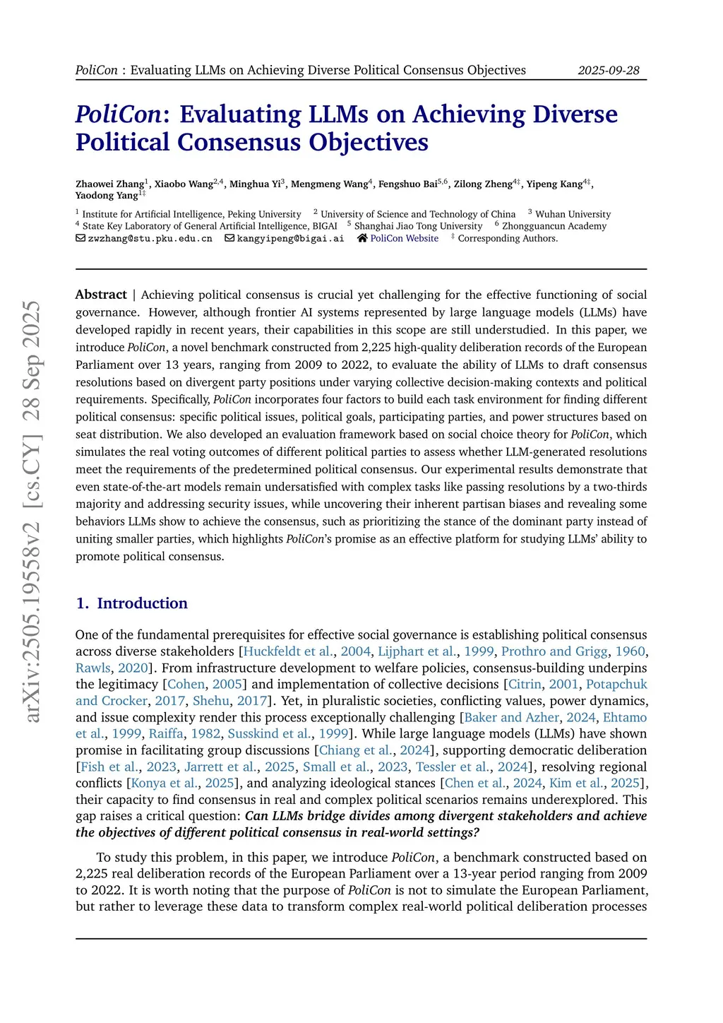 Achieving political consensus is crucial yet challenging for the effective functioning of social governance. However, although frontier AI systems represented by large language models (LLMs) have developed rapidly in recent years, their capabilities in this scope are still understudied. In this paper, we introduce PoliCon, a novel benchmark constructed from 2,225 high-quality deliberation records of the European Parliament over 13 years, ranging from 2009 to 2022, to evaluate the ability of LLMs to draft consensus resolutions based on divergent party positions under varying collective decision-making contexts and political requirements. Specifically, PoliCon incorporates four factors to build each task environment for finding different political consensus: specific political issues, political goals, participating parties, and power structures based on seat distribution. We also developed an evaluation framework based on social choice theory for PoliCon, which simulates the real voting outcomes of different political parties to assess whether LLM-generated resolutions meet the requirements of the predetermined political consensus. Our experimental results demonstrate that even state-of-the-art models remain undersatisfied with complex tasks like passing resolutions by a two-thirds majority and addressing security issues, while uncovering their inherent partisan biases and revealing some behaviors LLMs show to achieve the consensus, such as prioritizing the stance of the dominant party instead of uniting smaller parties, which highlights PoliCon's promise as an effective platform for studying LLMs' ability to promote political consensus. The code and dataset are released atthis https URL.