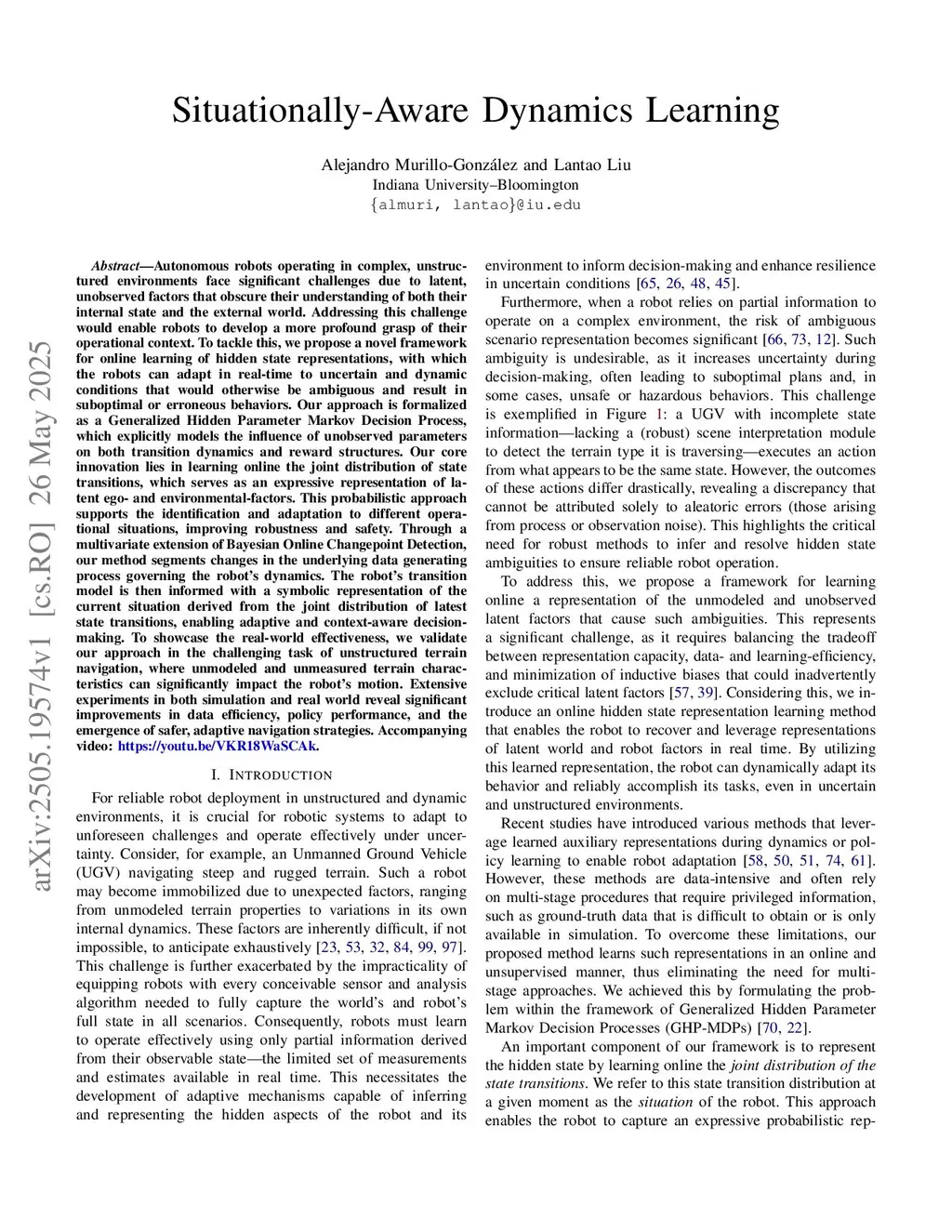 Autonomous robots operating in complex, unstructured environments face significant challenges due to latent, unobserved factors that obscure their understanding of both their internal state and the external world. Addressing this challenge would enable robots to develop a more profound grasp of their operational context. To tackle this, we propose a novel framework for online learning of hidden state representations, with which the robots can adapt in real-time to uncertain and dynamic conditions that would otherwise be ambiguous and result in suboptimal or erroneous behaviors. Our approach is formalized as a Generalized Hidden Parameter Markov Decision Process, which explicitly models the influence of unobserved parameters on both transition dynamics and reward structures. Our core innovation lies in learning online the joint distribution of state transitions, which serves as an expressive representation of latent ego- and environmental-factors. This probabilistic approach supports the identification and adaptation to different operational situations, improving robustness and safety. Through a multivariate extension of Bayesian Online Changepoint Detection, our method segments changes in the underlying data generating process governing the robot's dynamics. The robot's transition model is then informed with a symbolic representation of the current situation derived from the joint distribution of latest state transitions, enabling adaptive and context-aware decision-making. To showcase the real-world effectiveness, we validate our approach in the challenging task of unstructured terrain navigation, where unmodeled and unmeasured terrain characteristics can significantly impact the robot's motion. Extensive experiments in both simulation and real world reveal significant improvements in data efficiency, policy performance, and the emergence of safer, adaptive navigation strategies.