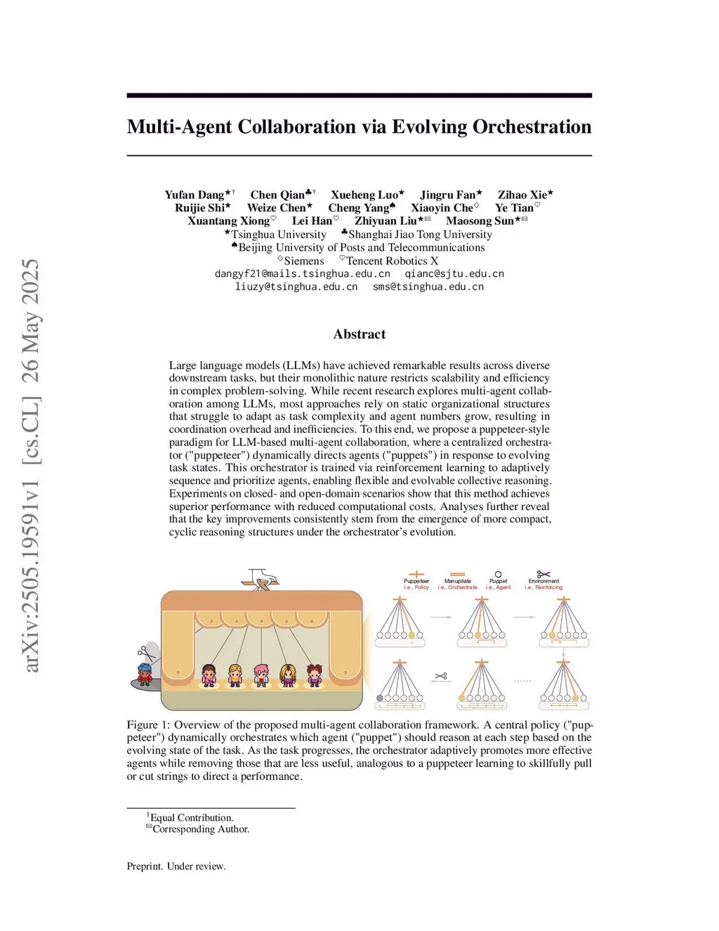 Large language models (LLMs) have achieved remarkable results across diverse downstream tasks, but their monolithic nature restricts scalability and efficiency in complex problem-solving. While recent research explores multi-agent collaboration among LLMs, most approaches rely on static organizational structures that struggle to adapt as task complexity and agent numbers grow, resulting in coordination overhead and inefficiencies. To this end, we propose a puppeteer-style paradigm for LLM-based multi-agent collaboration, where a centralized orchestrator ("puppeteer") dynamically directs agents ("puppets") in response to evolving task states. This orchestrator is trained via reinforcement learning to adaptively sequence and prioritize agents, enabling flexible and evolvable collective reasoning. Experiments on closed- and open-domain scenarios show that this method achieves superior performance with reduced computational costs. Analyses further reveal that the key improvements consistently stem from the emergence of more compact, cyclic reasoning structures under the orchestrator's evolution. Our code is available atthis https URL.