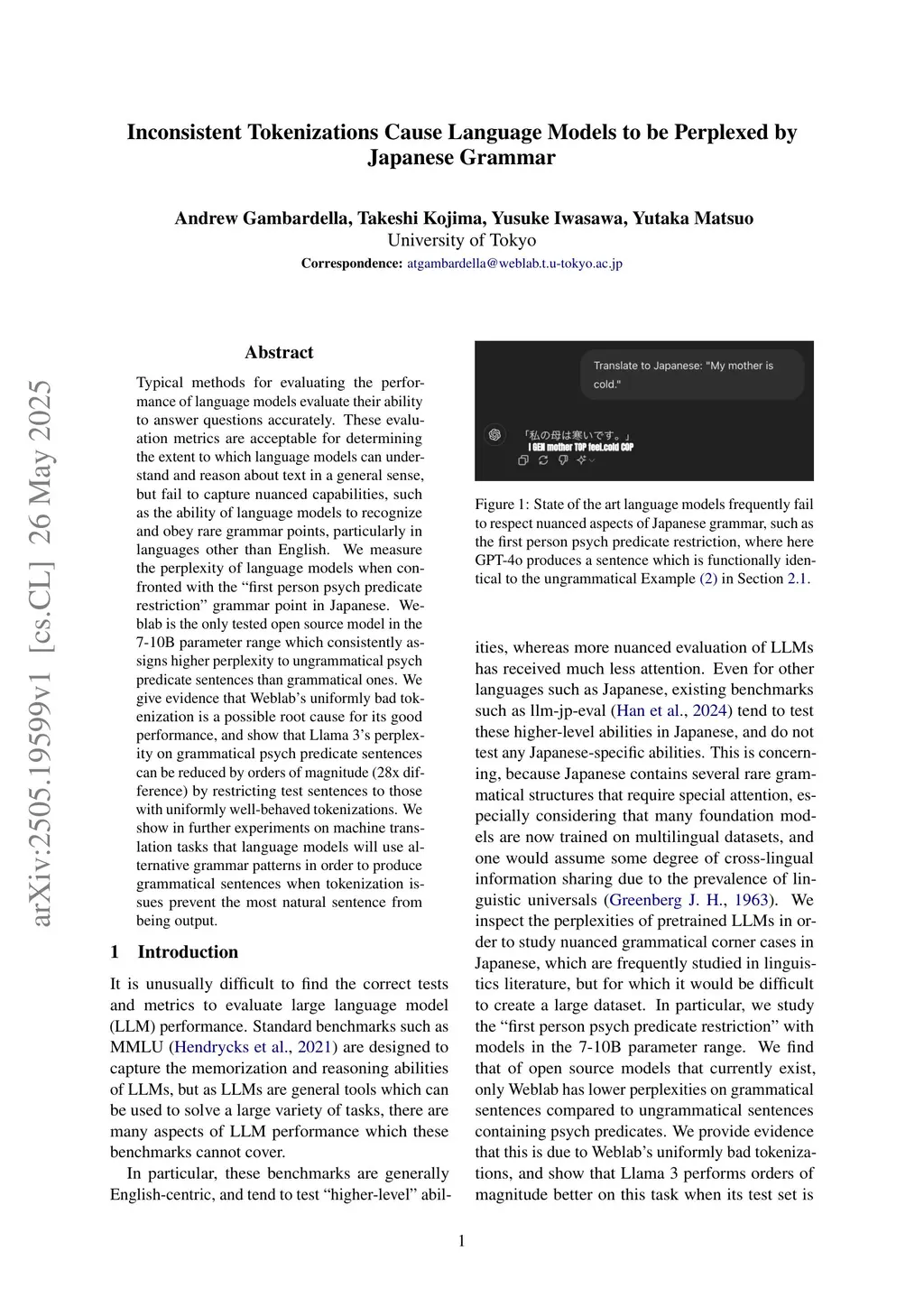 Typical methods for evaluating the performance of language models evaluate their ability to answer questions accurately. These evaluation metrics are acceptable for determining the extent to which language models can understand and reason about text in a general sense, but fail to capture nuanced capabilities, such as the ability of language models to recognize and obey rare grammar points, particularly in languages other than English. We measure the perplexity of language models when confronted with the "first person psych predicate restriction" grammar point in Japanese. Weblab is the only tested open source model in the 7-10B parameter range which consistently assigns higher perplexity to ungrammatical psych predicate sentences than grammatical ones. We give evidence that Weblab's uniformly bad tokenization is a possible root cause for its good performance, and show that Llama 3's perplexity on grammatical psych predicate sentences can be reduced by orders of magnitude (28x difference) by restricting test sentences to those with uniformly well-behaved tokenizations. We show in further experiments on machine translation tasks that language models will use alternative grammar patterns in order to produce grammatical sentences when tokenization issues prevent the most natural sentence from being output.