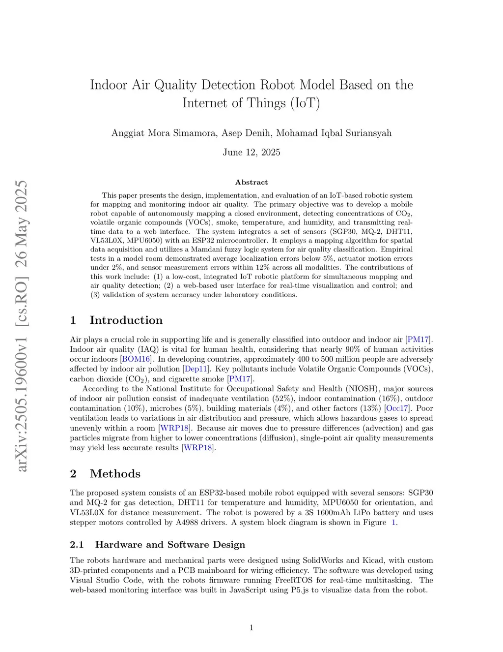 This paper presents the design, implementation, and evaluation of an IoT-based robotic system for mapping and monitoring indoor air quality. The primary objective was to develop a mobile robot capable of autonomously mapping a closed environment, detecting concentrations of CO, volatile organic compounds (VOCs), smoke, temperature, and humidity, and transmitting real-time data to a web interface. The system integrates a set of sensors (SGP30, MQ-2, DHT11, VL53L0X, MPU6050) with an ESP32 microcontroller. It employs a mapping algorithm for spatial data acquisition and utilizes a Mamdani fuzzy logic system for air quality classification. Empirical tests in a model room demonstrated average localization errors below , actuator motion errors under , and sensor measurement errors within across all modalities. The contributions of this work include: (1) a low-cost, integrated IoT robotic platform for simultaneous mapping and air quality detection; (2) a web-based user interface for real-time visualization and control; and (3) validation of system accuracy under laboratory conditions.