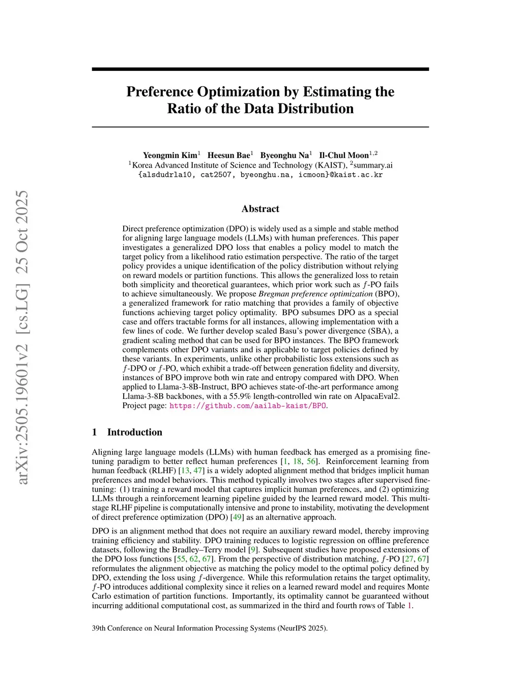 Preference Optimization by Estimating the Ratio of the Data Distribution