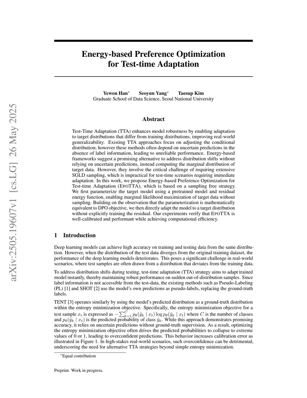 Test-Time Adaptation (TTA) enhances model robustness by enabling adaptation to target distributions that differ from training distributions, improving real-world generalizability. Existing TTA approaches focus on adjusting the conditional distribution; however these methods often depend on uncertain predictions in the absence of label information, leading to unreliable performance. Energy-based frameworks suggest a promising alternative to address distribution shifts without relying on uncertain predictions, instead computing the marginal distribution of target data. However, they involve the critical challenge of requiring extensive SGLD sampling, which is impractical for test-time scenarios requiring immediate adaptation. In this work, we propose Energy-based Preference Optimization for Test-time Adaptation (EPOTTA), which is based on a sampling free strategy. We first parameterize the target model using a pretrained model and residual energy function, enabling marginal likelihood maximization of target data without sampling. Building on the observation that the parameterization is mathematically equivalent to DPO objective, we then directly adapt the model to a target distribution without explicitly training the residual. Our experiments verify that EPOTTA is well-calibrated and performant while achieving computational efficiency.