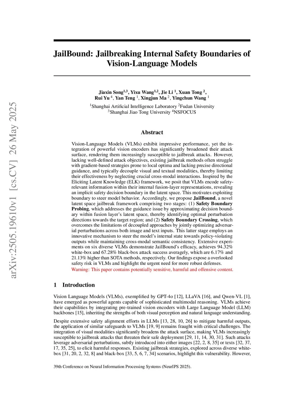 Vision-Language Models (VLMs) exhibit impressive performance, yet the integration of powerful vision encoders has significantly broadened their attack surface, rendering them increasingly susceptible to jailbreak attacks. However, lacking well-defined attack objectives, existing jailbreak methods often struggle with gradient-based strategies prone to local optima and lacking precise directional guidance, and typically decouple visual and textual modalities, thereby limiting their effectiveness by neglecting crucial cross-modal interactions. Inspired by the Eliciting Latent Knowledge (ELK) framework, we posit that VLMs encode safety-relevant information within their internal fusion-layer representations, revealing an implicit safety decision boundary in the latent space. This motivates exploiting boundary to steer model behavior. Accordingly, we propose JailBound, a novel latent space jailbreak framework comprising two stages: (1) Safety Boundary Probing, which addresses the guidance issue by approximating decision boundary within fusion layer's latent space, thereby identifying optimal perturbation directions towards the target region; and (2) Safety Boundary Crossing, which overcomes the limitations of decoupled approaches by jointly optimizing adversarial perturbations across both image and text inputs. This latter stage employs an innovative mechanism to steer the model's internal state towards policy-violating outputs while maintaining cross-modal semantic consistency. Extensive experiments on six diverse VLMs demonstrate JailBound's efficacy, achieves 94.32% white-box and 67.28% black-box attack success averagely, which are 6.17% and 21.13% higher than SOTA methods, respectively. Our findings expose a overlooked safety risk in VLMs and highlight the urgent need for more robust defenses. Warning: This paper contains potentially sensitive, harmful and offensive content.