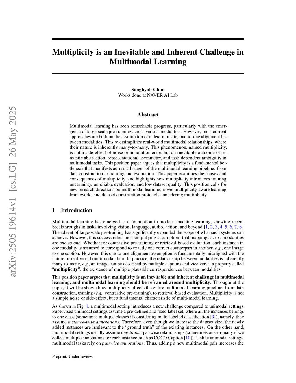 Multimodal learning has seen remarkable progress, particularly with the emergence of large-scale pre-training across various modalities. However, most current approaches are built on the assumption of a deterministic, one-to-one alignment between modalities. This oversimplifies real-world multimodal relationships, where their nature is inherently many-to-many. This phenomenon, named multiplicity, is not a side-effect of noise or annotation error, but an inevitable outcome of semantic abstraction, representational asymmetry, and task-dependent ambiguity in multimodal tasks. This position paper argues that multiplicity is a fundamental bottleneck that manifests across all stages of the multimodal learning pipeline: from data construction to training and evaluation. This paper examines the causes and consequences of multiplicity, and highlights how multiplicity introduces training uncertainty, unreliable evaluation, and low dataset quality. This position calls for new research directions on multimodal learning: novel multiplicity-aware learning frameworks and dataset construction protocols considering multiplicity.