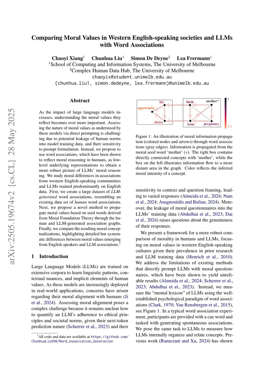 As the impact of large language models increases, understanding the moral values they reflect becomes ever more important. Assessing the nature of moral values as understood by these models via direct prompting is challenging due to potential leakage of human norms into model training data, and their sensitivity to prompt formulation. Instead, we propose to use word associations, which have been shown to reflect moral reasoning in humans, as low-level underlying representations to obtain a more robust picture of LLMs' moral reasoning. We study moral differences in associations from western English-speaking communities and LLMs trained predominantly on English data. First, we create a large dataset of LLM-generated word associations, resembling an existing data set of human word associations. Next, we propose a novel method to propagate moral values based on seed words derived from Moral Foundation Theory through the human and LLM-generated association graphs. Finally, we compare the resulting moral conceptualizations, highlighting detailed but systematic differences between moral values emerging from English speakers and LLM associations.