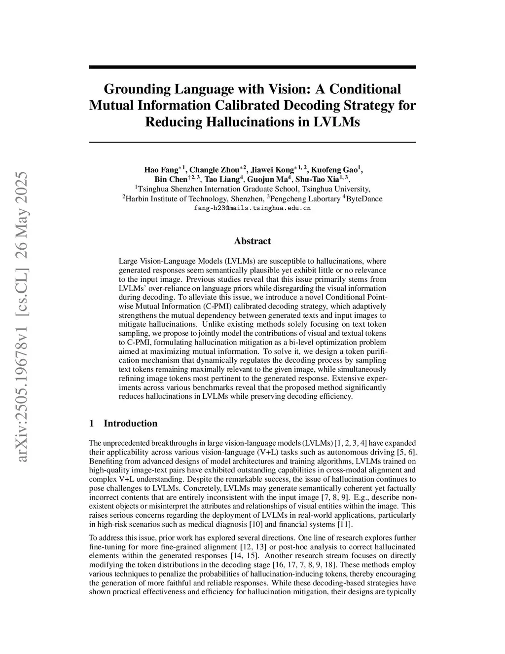 Large Vision-Language Models (LVLMs) are susceptible to hallucinations, where generated responses seem semantically plausible yet exhibit little or no relevance to the input image. Previous studies reveal that this issue primarily stems from LVLMs' over-reliance on language priors while disregarding the visual information during decoding. To alleviate this issue, we introduce a novel Conditional Pointwise Mutual Information (C-PMI) calibrated decoding strategy, which adaptively strengthens the mutual dependency between generated texts and input images to mitigate hallucinations. Unlike existing methods solely focusing on text token sampling, we propose to jointly model the contributions of visual and textual tokens to C-PMI, formulating hallucination mitigation as a bi-level optimization problem aimed at maximizing mutual information. To solve it, we design a token purification mechanism that dynamically regulates the decoding process by sampling text tokens remaining maximally relevant to the given image, while simultaneously refining image tokens most pertinent to the generated response. Extensive experiments across various benchmarks reveal that the proposed method significantly reduces hallucinations in LVLMs while preserving decoding efficiency.