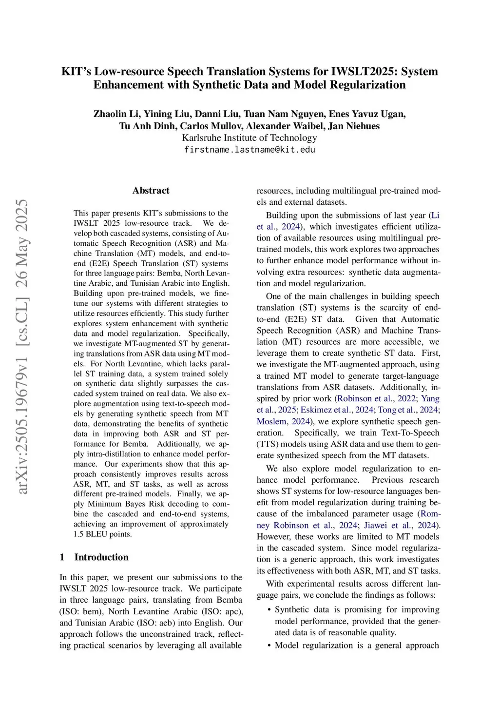 This paper presents KIT's submissions to the IWSLT 2025 low-resource track. We develop both cascaded systems, consisting of Automatic Speech Recognition (ASR) and Machine Translation (MT) models, and end-to-end (E2E) Speech Translation (ST) systems for three language pairs: Bemba, North Levantine Arabic, and Tunisian Arabic into English. Building upon pre-trained models, we fine-tune our systems with different strategies to utilize resources efficiently. This study further explores system enhancement with synthetic data and model regularization. Specifically, we investigate MT-augmented ST by generating translations from ASR data using MT models. For North Levantine, which lacks parallel ST training data, a system trained solely on synthetic data slightly surpasses the cascaded system trained on real data. We also explore augmentation using text-to-speech models by generating synthetic speech from MT data, demonstrating the benefits of synthetic data in improving both ASR and ST performance for Bemba. Additionally, we apply intra-distillation to enhance model performance. Our experiments show that this approach consistently improves results across ASR, MT, and ST tasks, as well as across different pre-trained models. Finally, we apply Minimum Bayes Risk decoding to combine the cascaded and end-to-end systems, achieving an improvement of approximately 1.5 BLEU points.